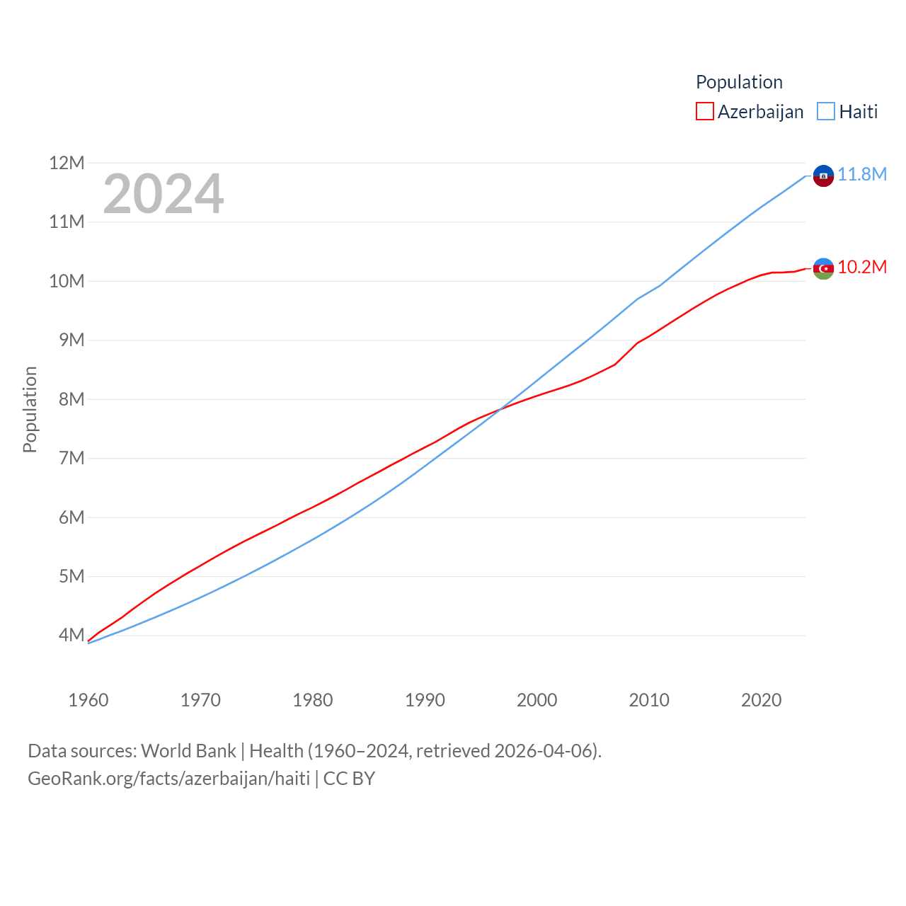 Azerbaijan has a population of 10.2M (ranked 95/197), compared with 11.8M in Haiti (ranked 83/197). Azerbaijan's land area is 31,911 sq mi versus 10,641 sq mi for Haiti (ranked 112th vs. 142nd).