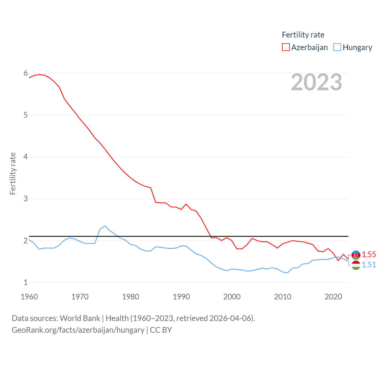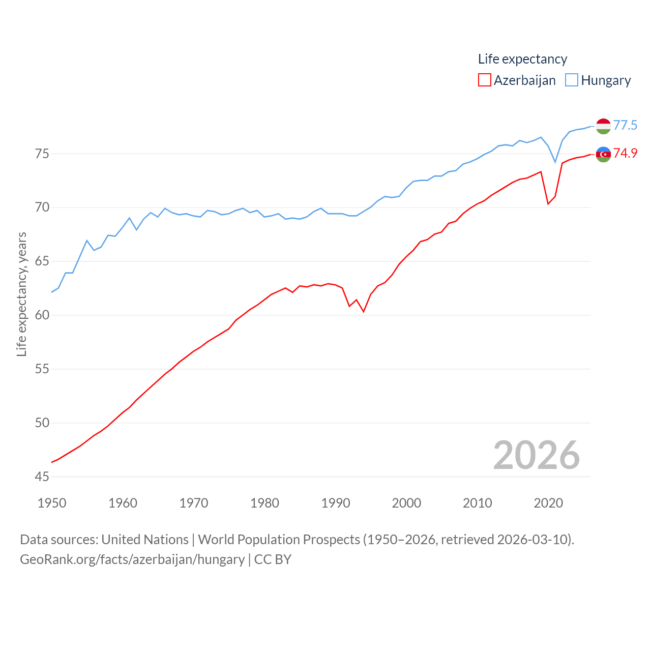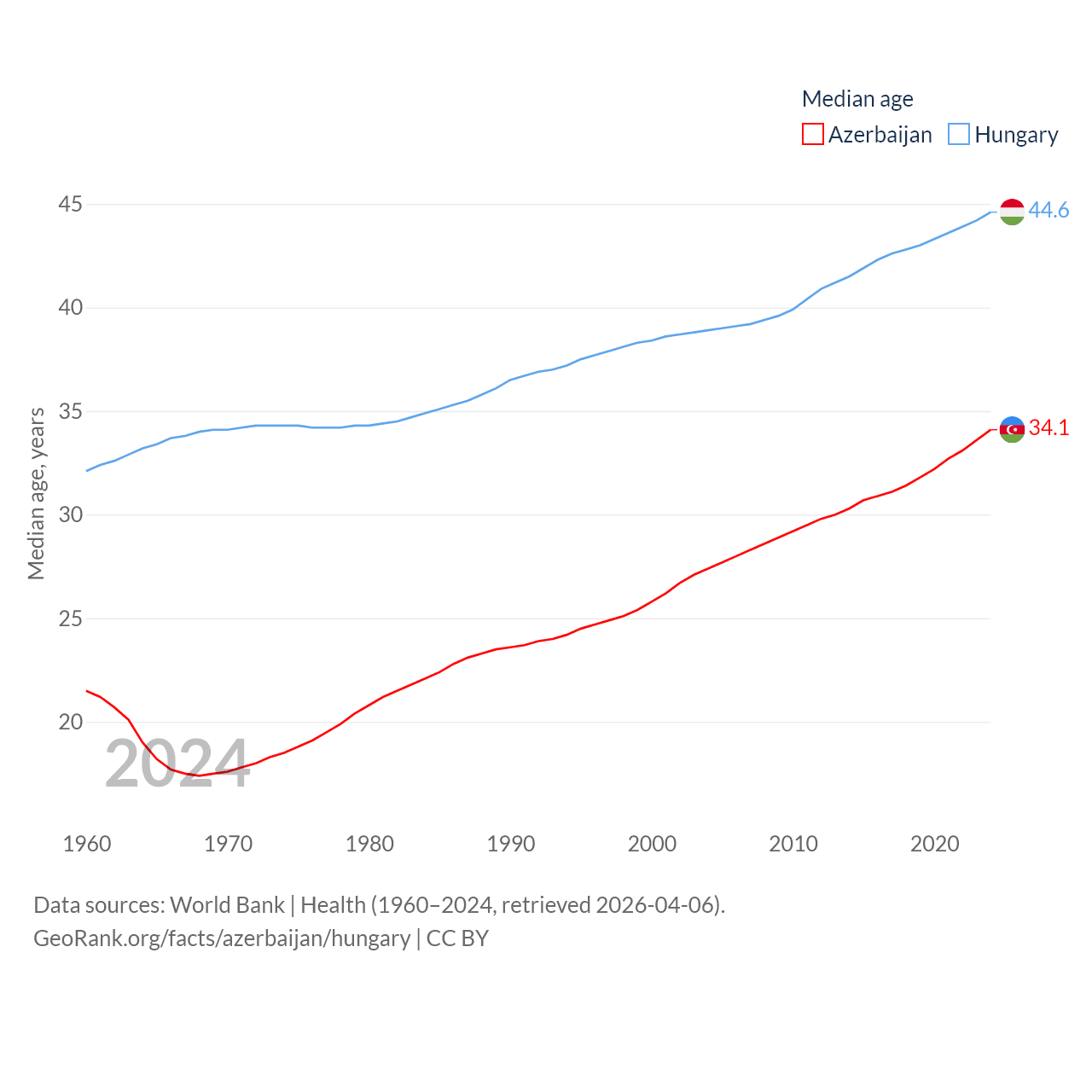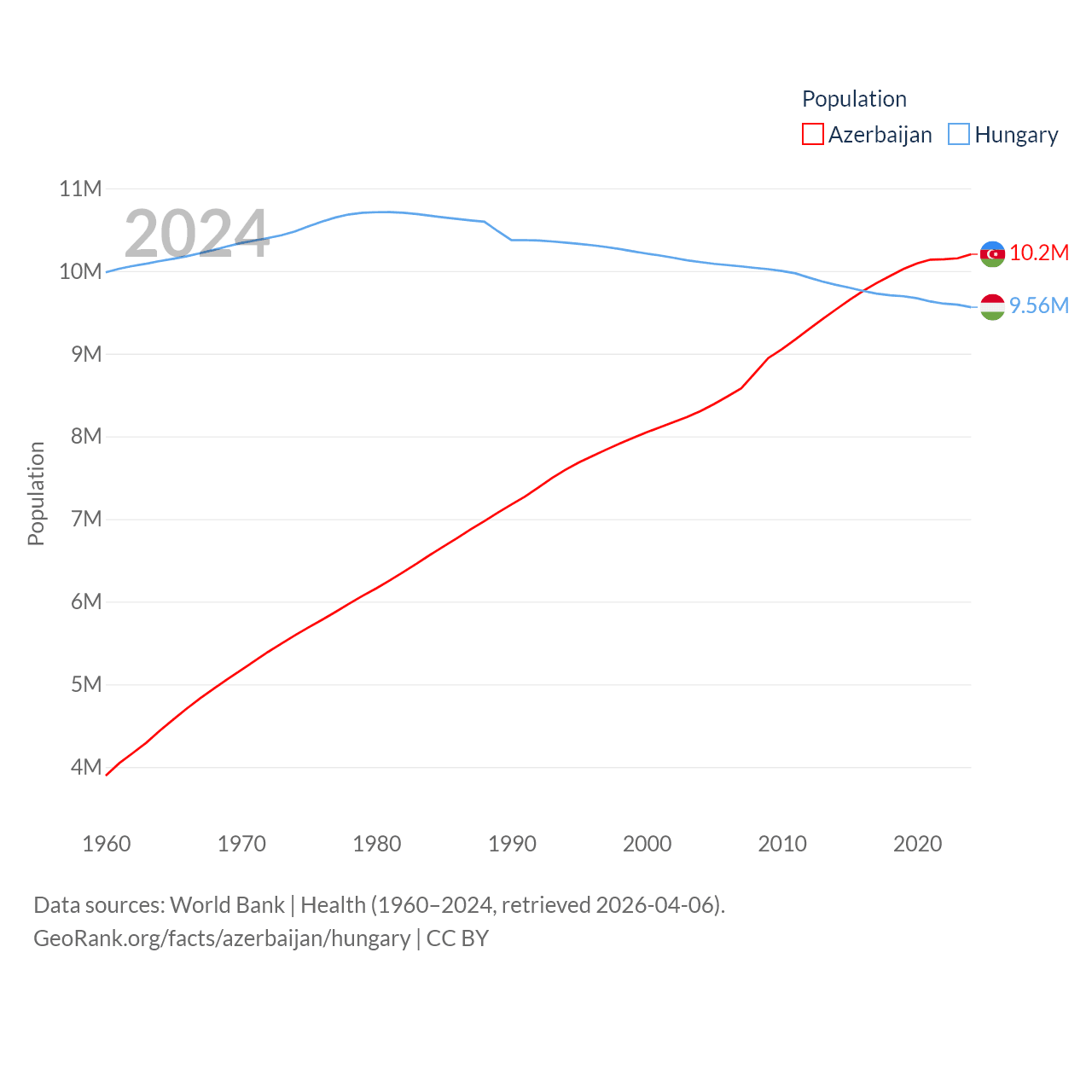 Azerbaijan has a population of 10.2M (ranked 95/197), compared with 9.56M in Hungary (ranked 97/197). Azerbaijan's land area is 31,911 sq mi versus 35,236 sq mi for Hungary (ranked 112th vs. 109th).