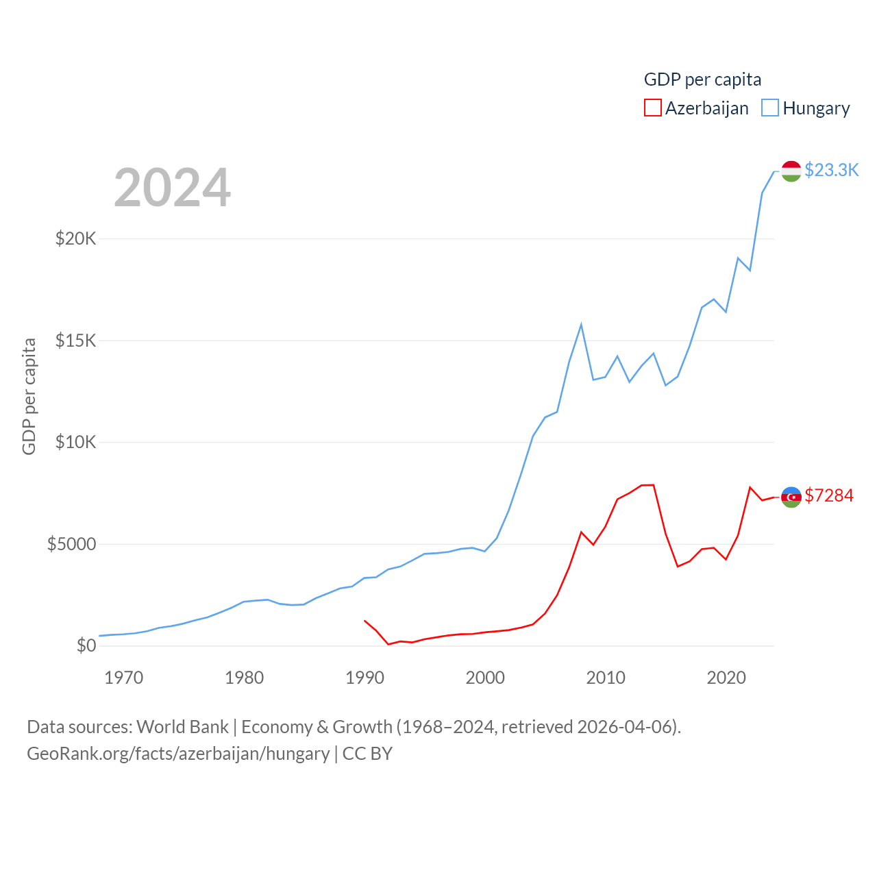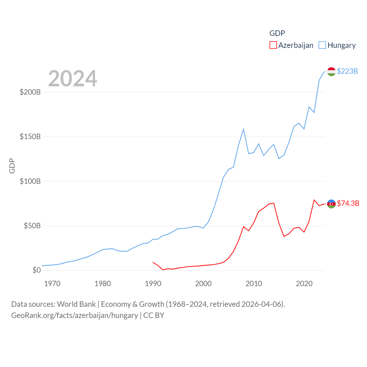By GDP, Azerbaijan ranks 84/197 ($74.3B) and Hungary ranks 55/197 ($223B). By GDP per capita, Azerbaijan ranks 101/197 ($7,284), while Hungary ranks 55/197 ($23,292).