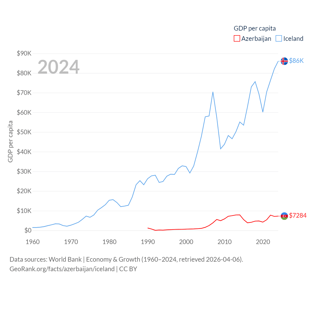 By GDP, Azerbaijan ranks 84/197 ($74.3B) and Iceland ranks 108/197 ($33.3B). By GDP per capita, Azerbaijan ranks 101/197 ($7,284), while Iceland ranks 9/197 ($86,041).