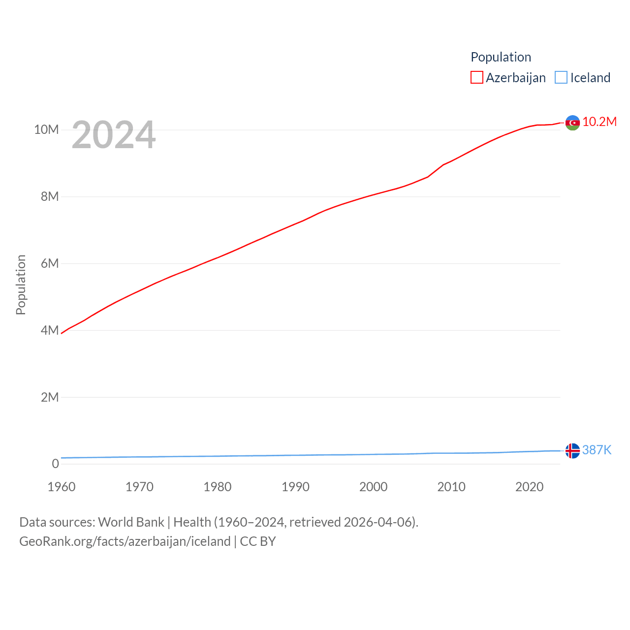 Azerbaijan has a population of 10.2M (ranked 95/197), compared with 387K in Iceland (ranked 173/197). Azerbaijan's land area is 31,911 sq mi versus 38,931 sq mi for Iceland (ranked 112th vs. 104th).