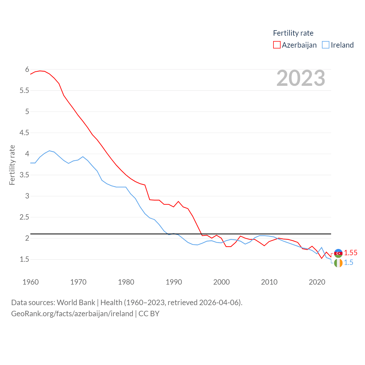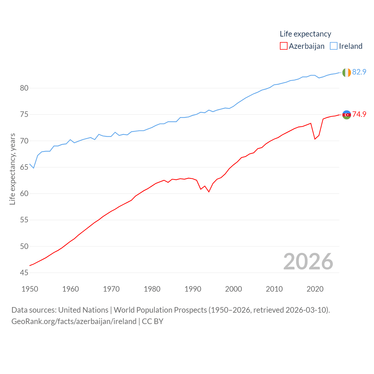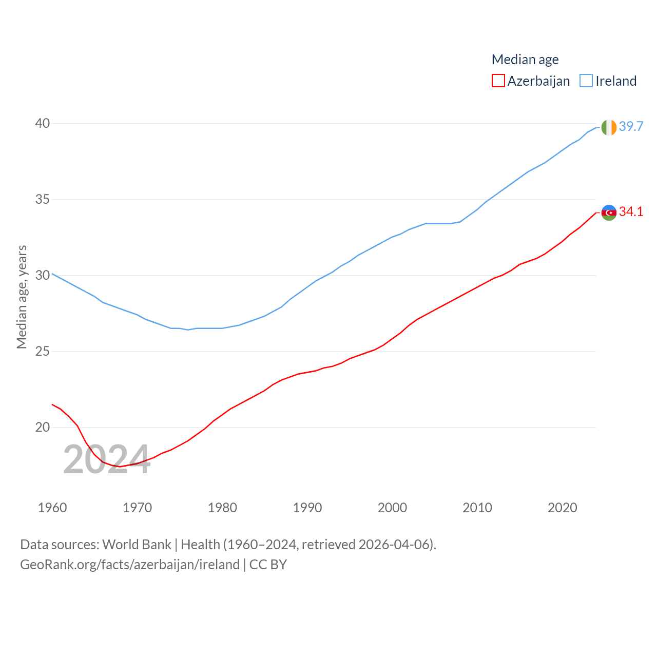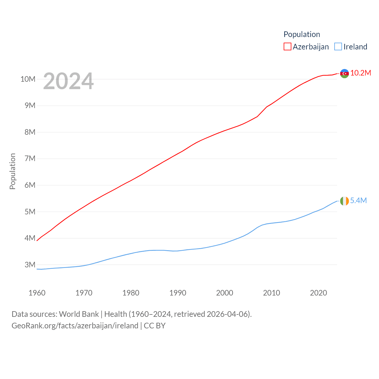 Azerbaijan has a population of 10.2M (ranked 95/197), compared with 5.4M in Ireland (ranked 120/197). Azerbaijan's land area is 31,911 sq mi versus 26,599 sq mi for Ireland (ranked 112th vs. 119th).