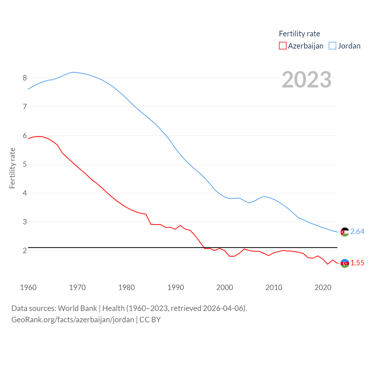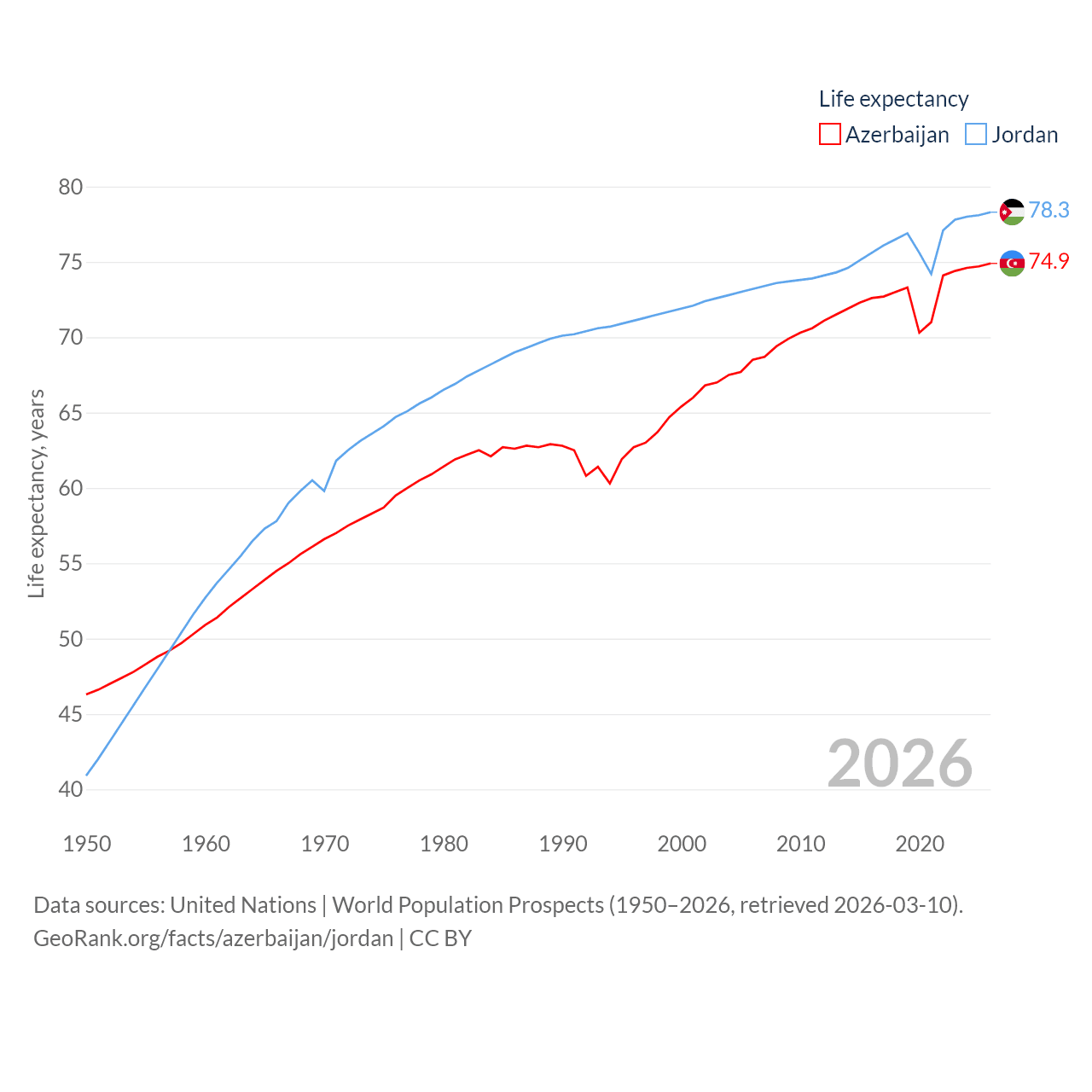 Azerbaijan has a population of 10.2M (ranked 95/197), compared with 11.6M in Jordan (ranked 84/197). Azerbaijan's land area is 31,911 sq mi versus 34,284 sq mi for Jordan (ranked 112th vs. 110th).