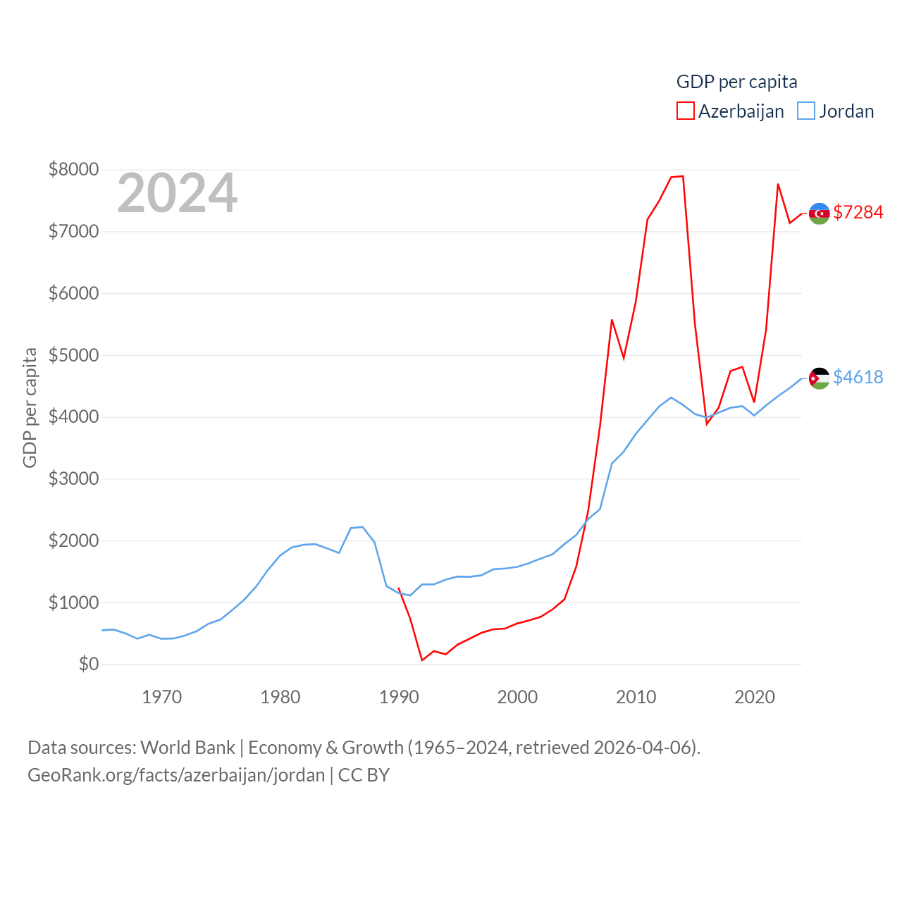 By GDP, Azerbaijan ranks 84/197 ($74.3B) and Jordan ranks 90/197 ($53.4B). By GDP per capita, Azerbaijan ranks 101/197 ($7,284), while Jordan ranks 123/197 ($4,618).