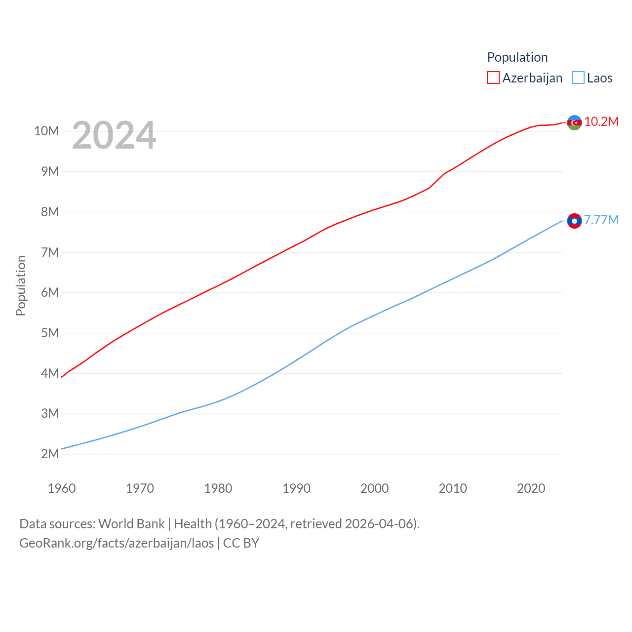 Azerbaijan has a population of 10.2M (ranked 95/197), compared with 7.77M in Laos (ranked 103/197). Azerbaijan's land area is 31,911 sq mi versus 89,112 sq mi for Laos (ranked 112th vs. 79th).