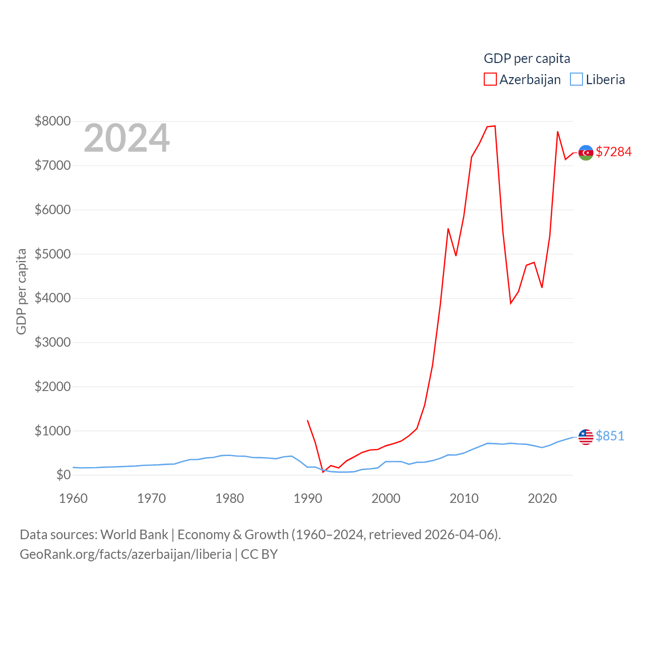 By GDP, Azerbaijan ranks 84/197 ($74.3B) and Liberia ranks 163/197 ($4.78B). By GDP per capita, Azerbaijan ranks 101/197 ($7,284), while Liberia ranks 184/197 ($851).