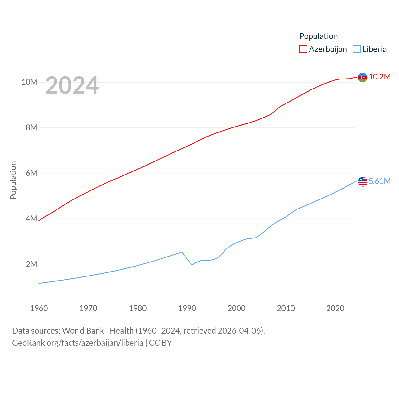 Azerbaijan has a population of 10.2M (ranked 95/197), compared with 5.61M in Liberia (ranked 117/197). Azerbaijan's land area is 31,911 sq mi versus 37,189 sq mi for Liberia (ranked 112th vs. 106th).