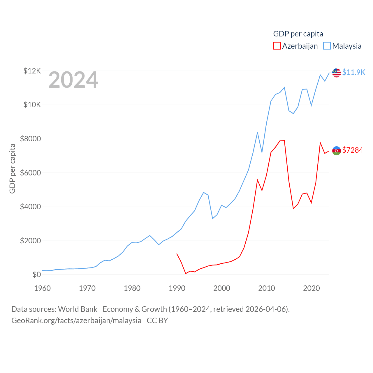 By GDP, Azerbaijan ranks 84/197 ($74.3B) and Malaysia ranks 38/197 ($422B). By GDP per capita, Azerbaijan ranks 101/197 ($7,284), while Malaysia ranks 79/197 ($11,874).