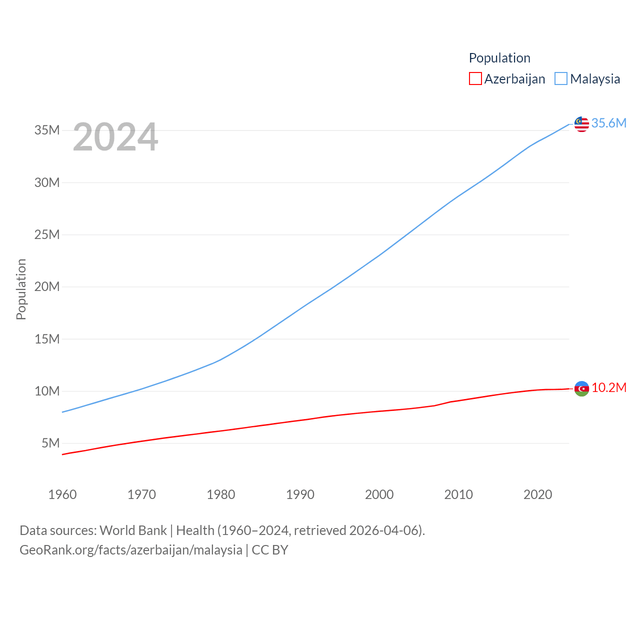 Azerbaijan has a population of 10.2M (ranked 95/197), compared with 35.6M in Malaysia (ranked 44/197). Azerbaijan's land area is 31,911 sq mi versus 126,854 sq mi for Malaysia (ranked 112th vs. 65th).