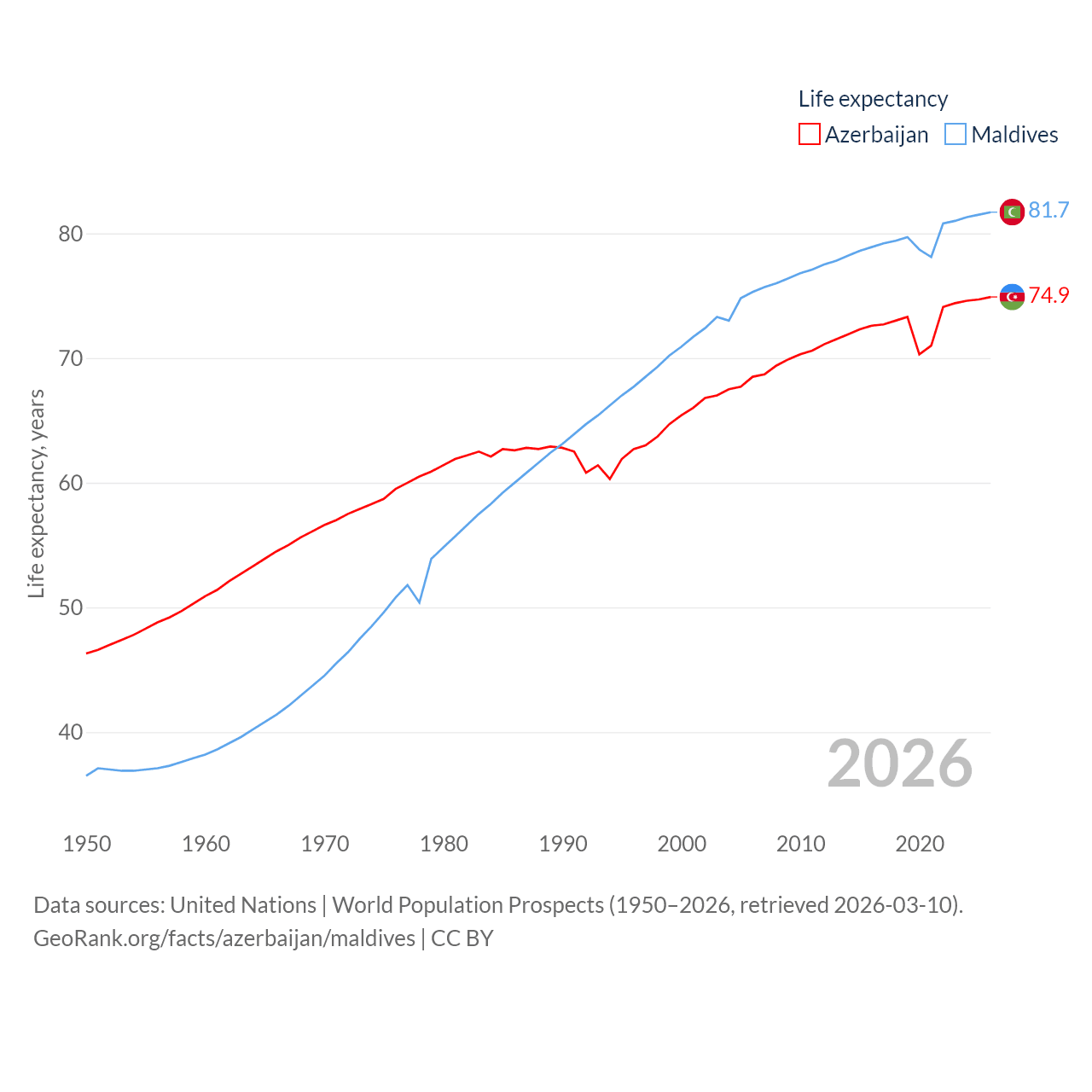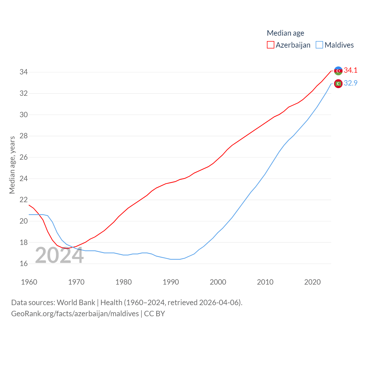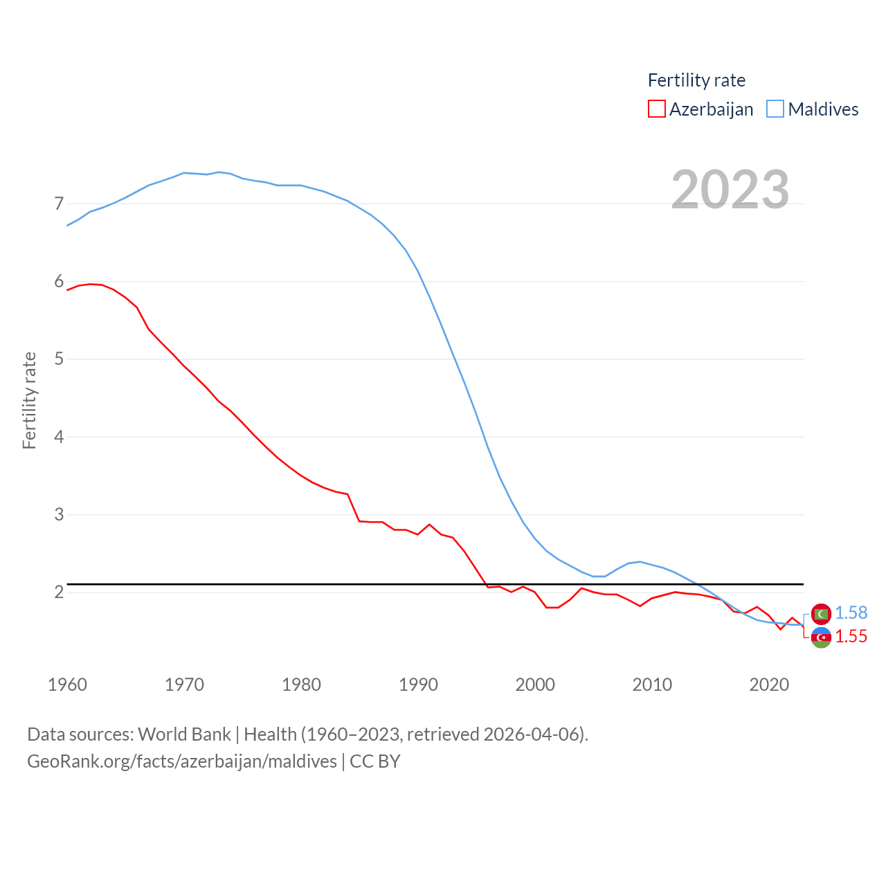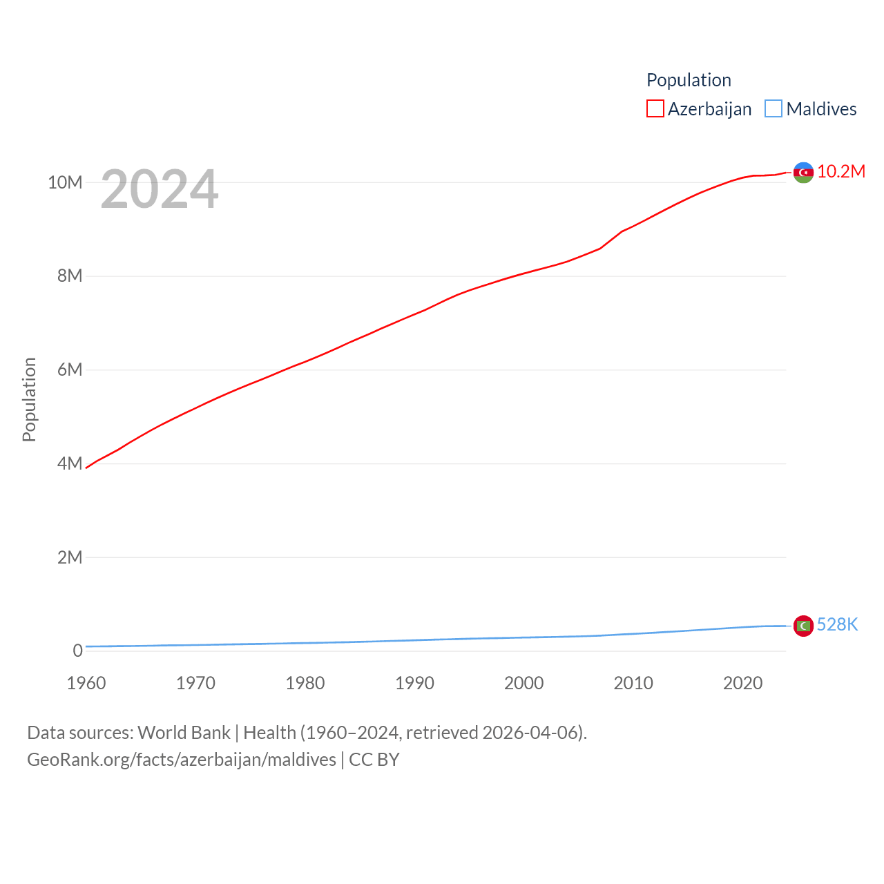 Azerbaijan has a population of 10.2M (ranked 95/197), compared with 528K in Maldives (ranked 168/197). Azerbaijan's land area is 31,911 sq mi versus 115.1 sq mi for Maldives (ranked 112th vs. 188th).