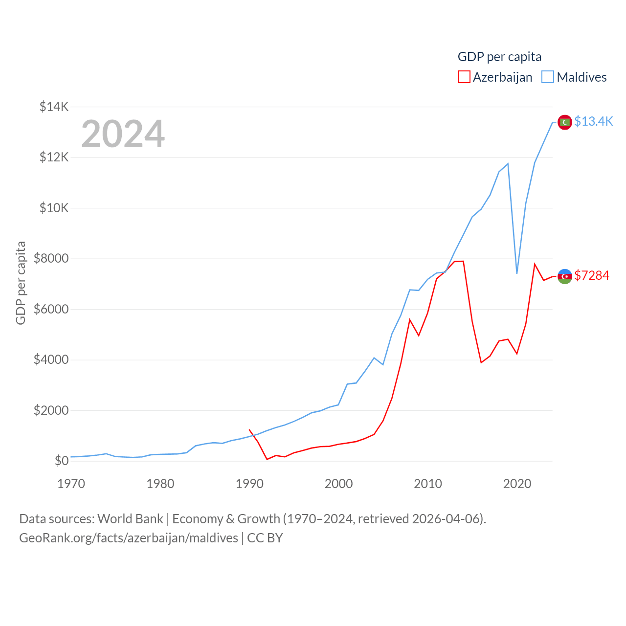 By GDP, Azerbaijan ranks 84/197 ($74.3B) and Maldives ranks 159/197 ($7.06B). By GDP per capita, Azerbaijan ranks 101/197 ($7,284), while Maldives ranks 75/197 ($13,379).
