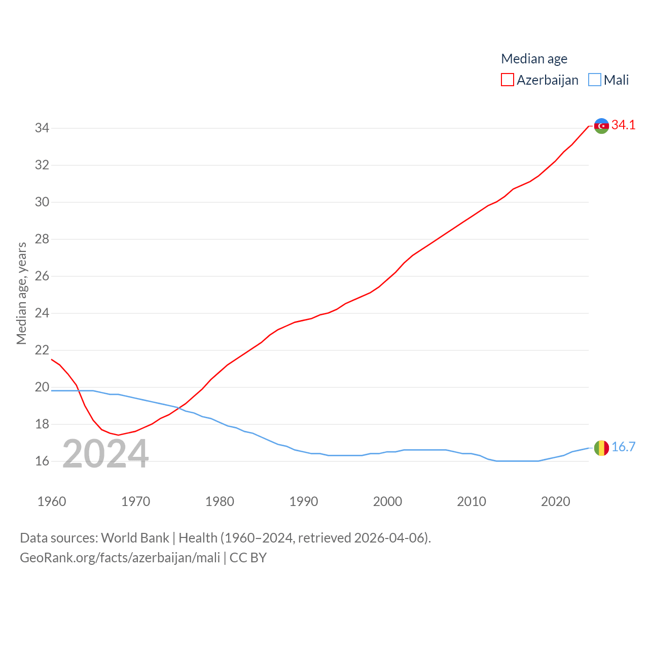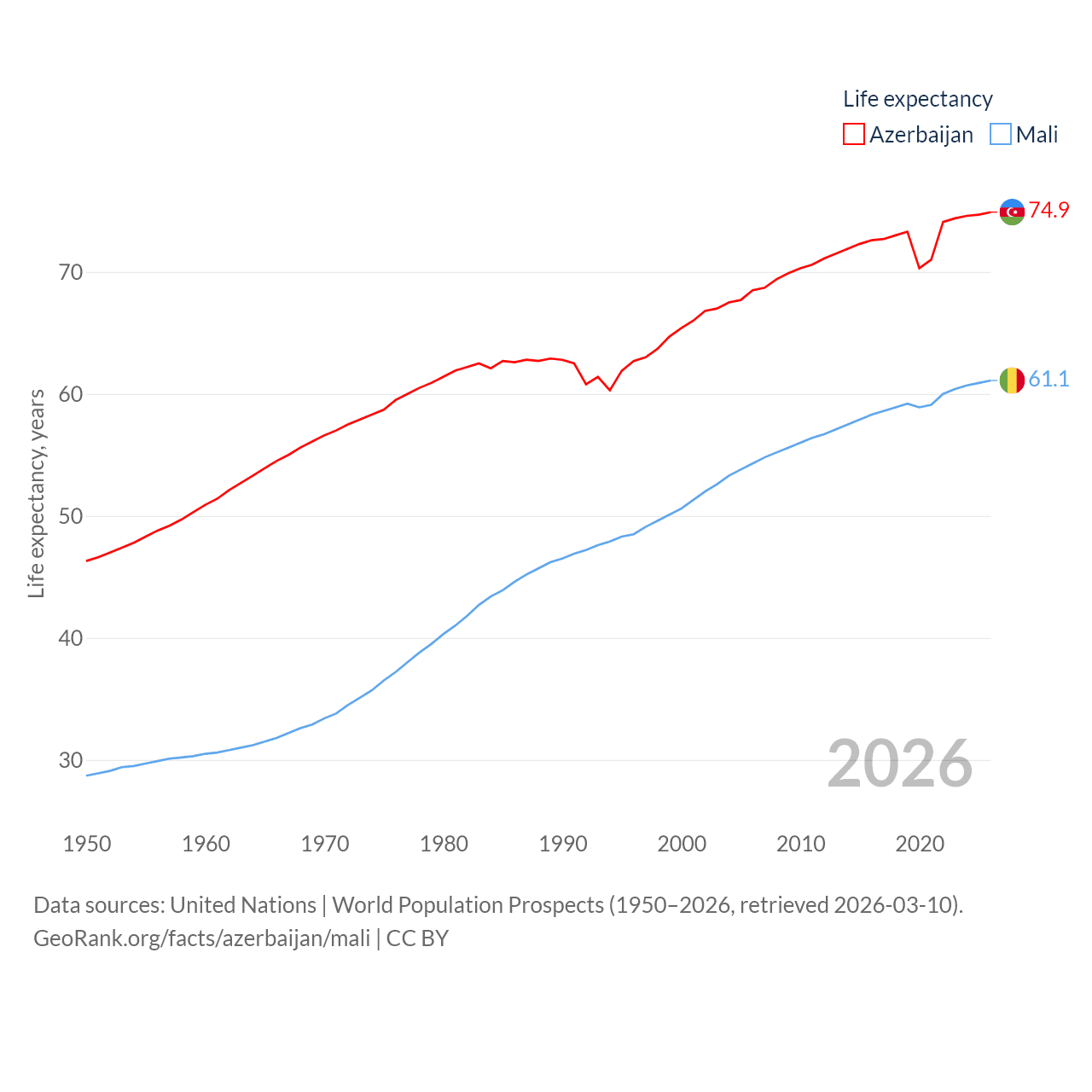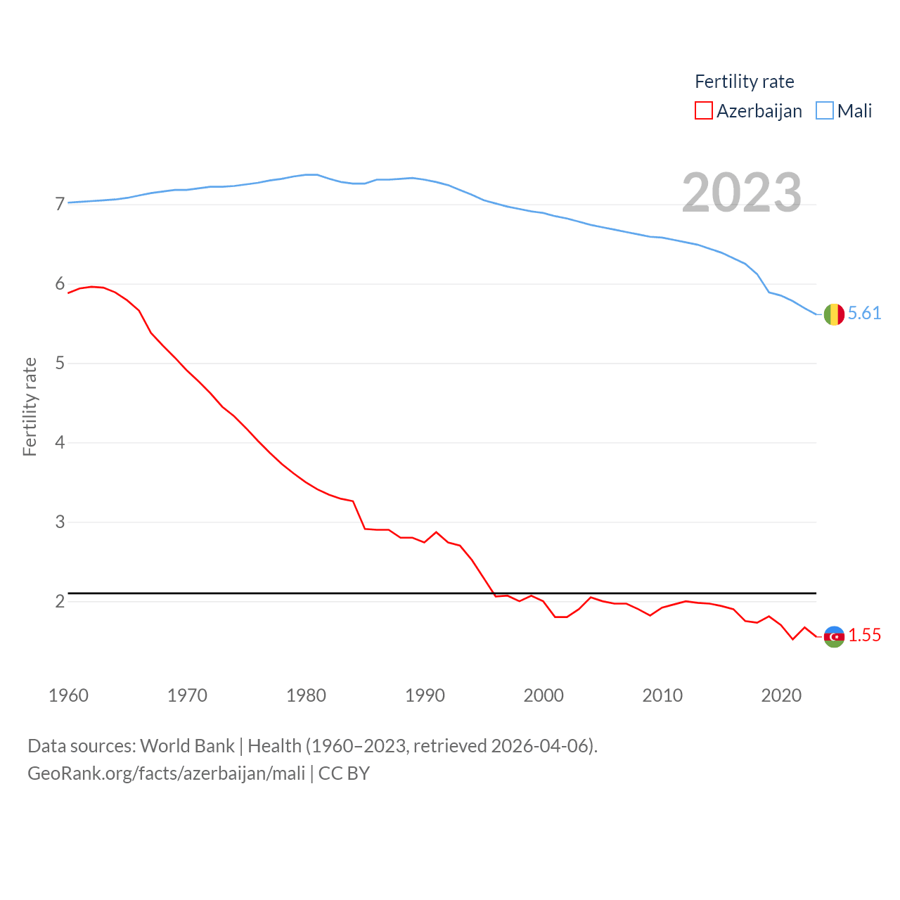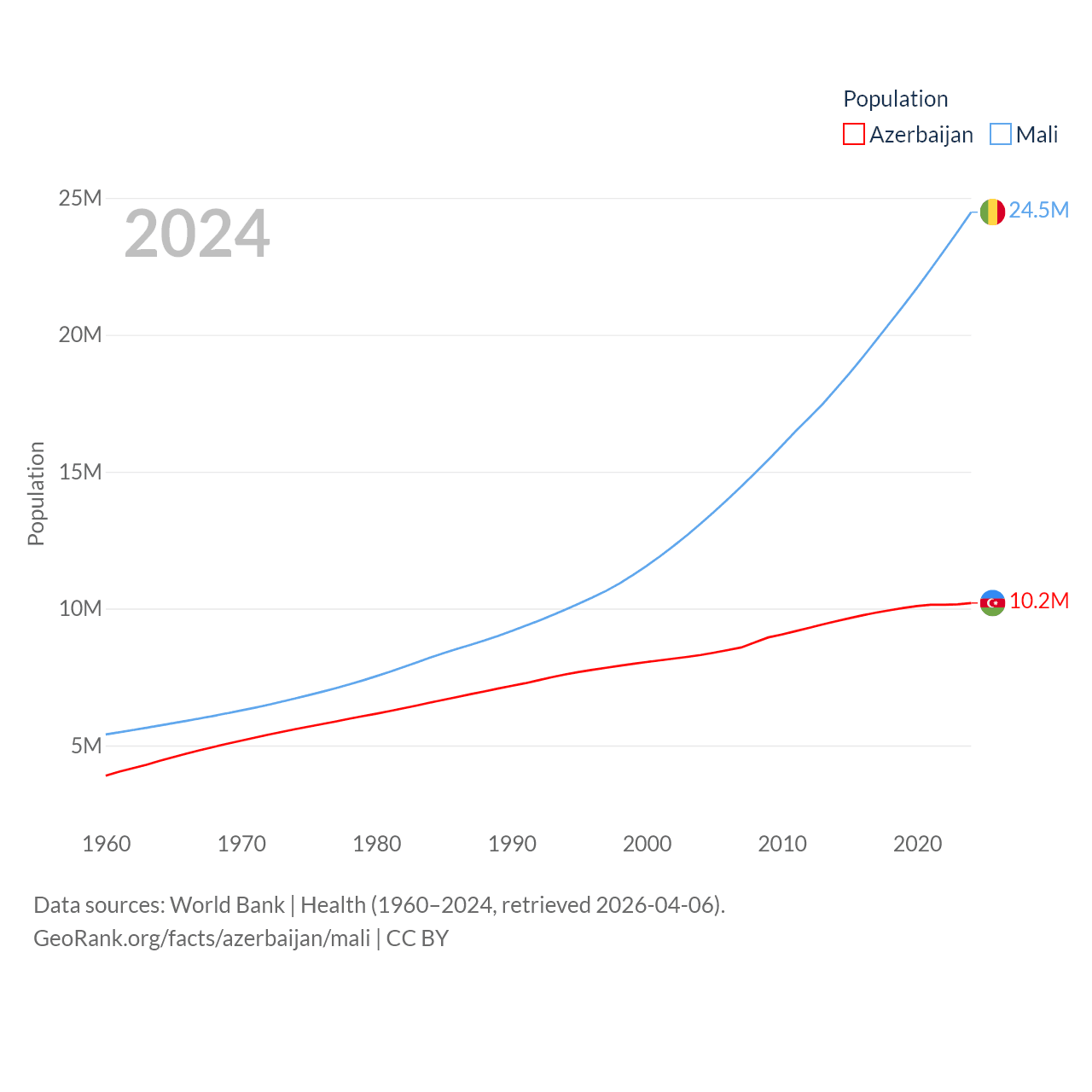 Azerbaijan has a population of 10.2M (ranked 95/197), compared with 24.5M in Mali (ranked 58/197). Azerbaijan's land area is 31,911 sq mi versus 471,118 sq mi for Mali (ranked 112th vs. 23rd).