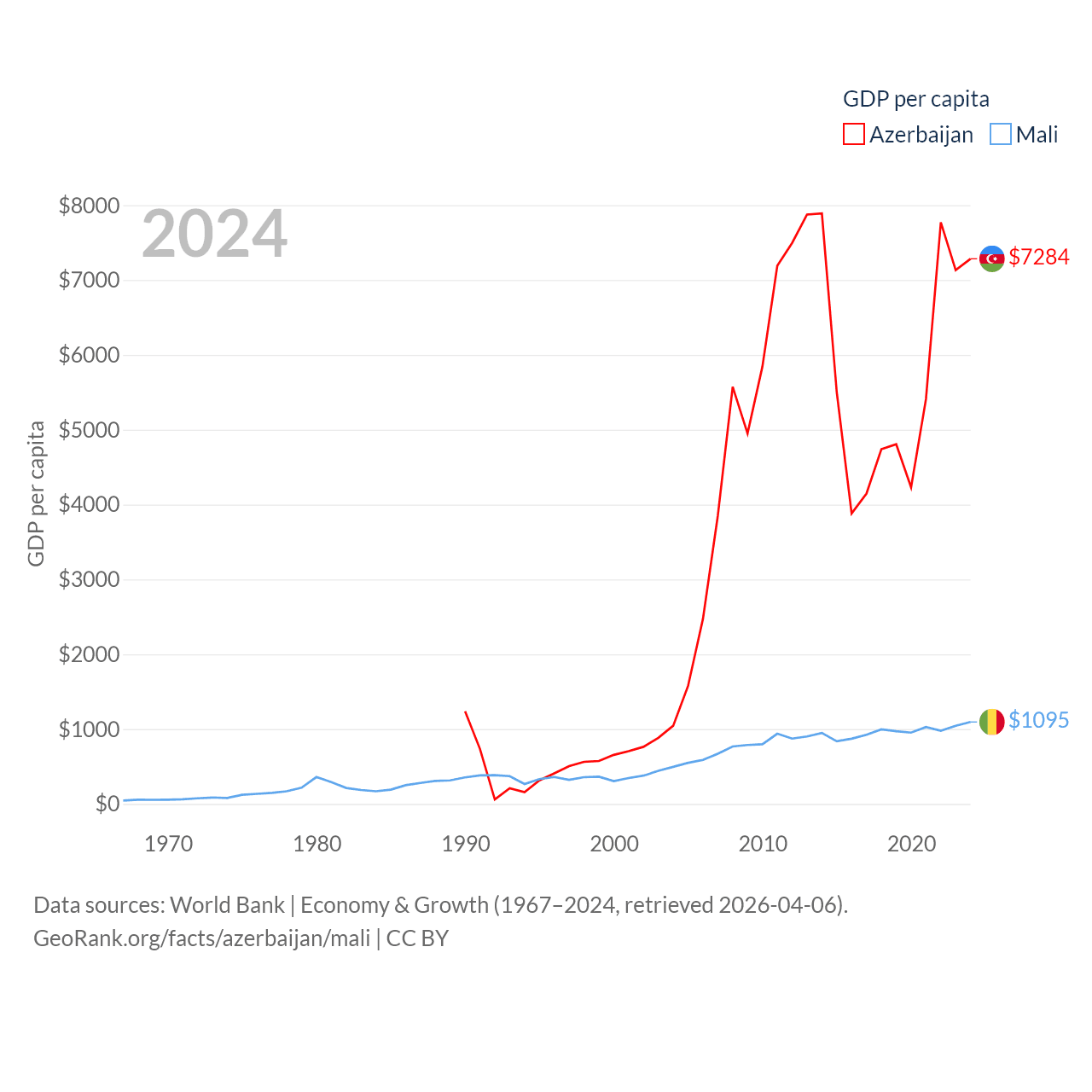 By GDP, Azerbaijan ranks 84/197 ($74.3B) and Mali ranks 113/197 ($26.8B). By GDP per capita, Azerbaijan ranks 101/197 ($7,284), while Mali ranks 173/197 ($1,095).