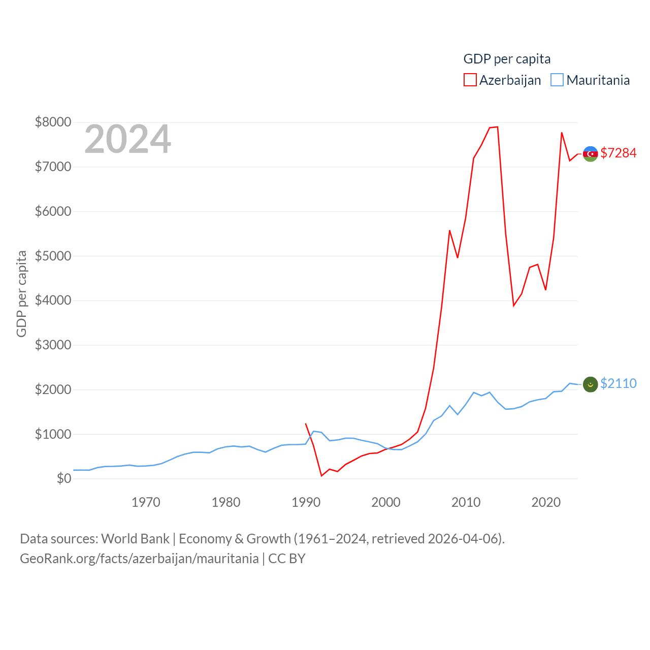 By GDP, Azerbaijan ranks 84/197 ($74.3B) and Mauritania ranks 153/197 ($10.9B). By GDP per capita, Azerbaijan ranks 101/197 ($7,284), while Mauritania ranks 156/197 ($2,110).
