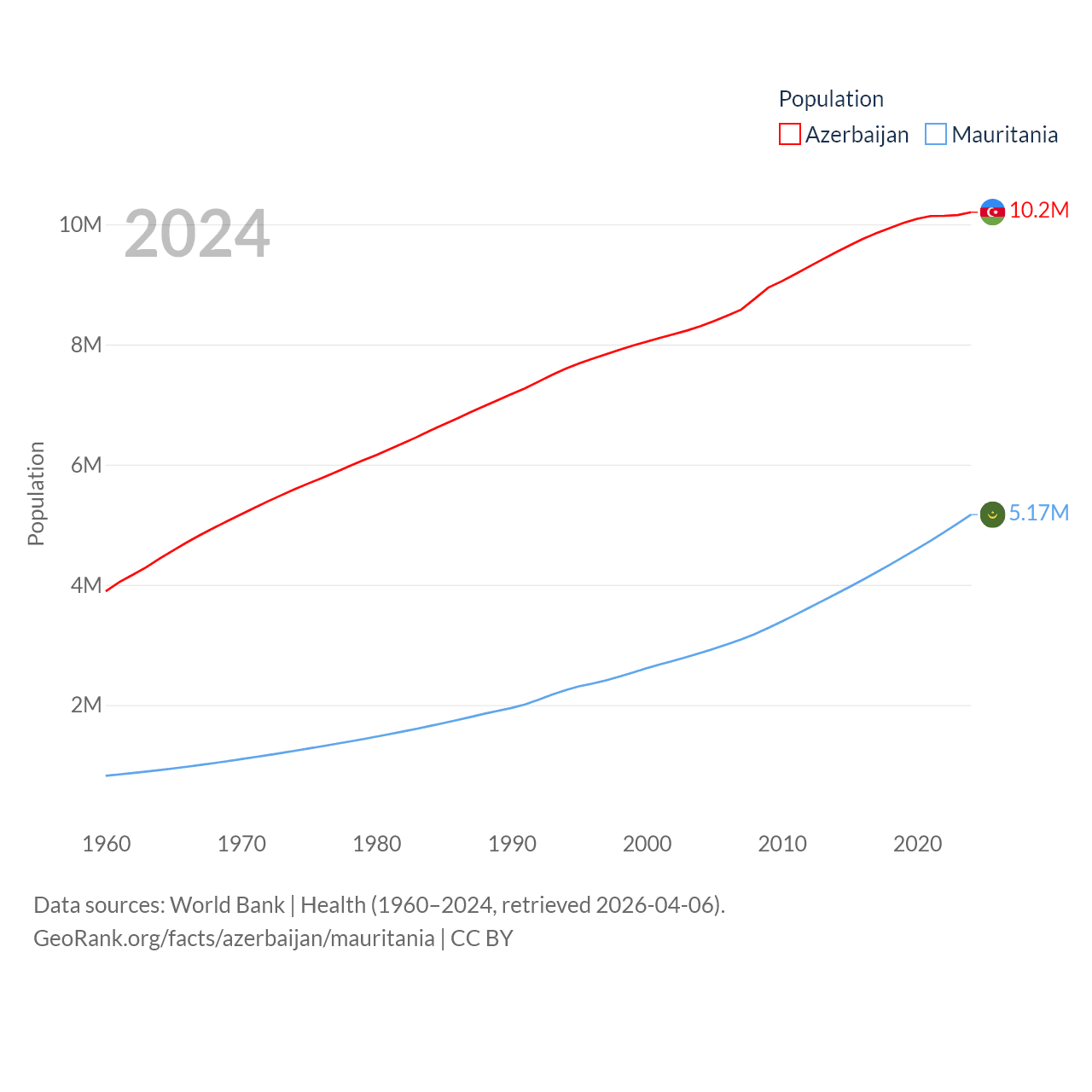 Azerbaijan has a population of 10.2M (ranked 95/197), compared with 5.17M in Mauritania (ranked 125/197). Azerbaijan's land area is 31,911 sq mi versus 397,955 sq mi for Mauritania (ranked 112th vs. 28th).