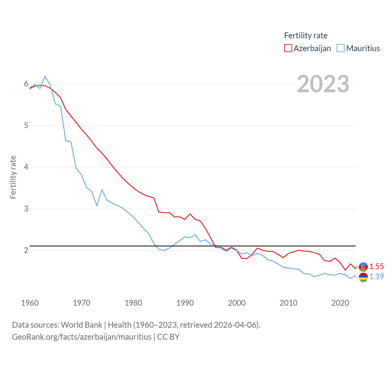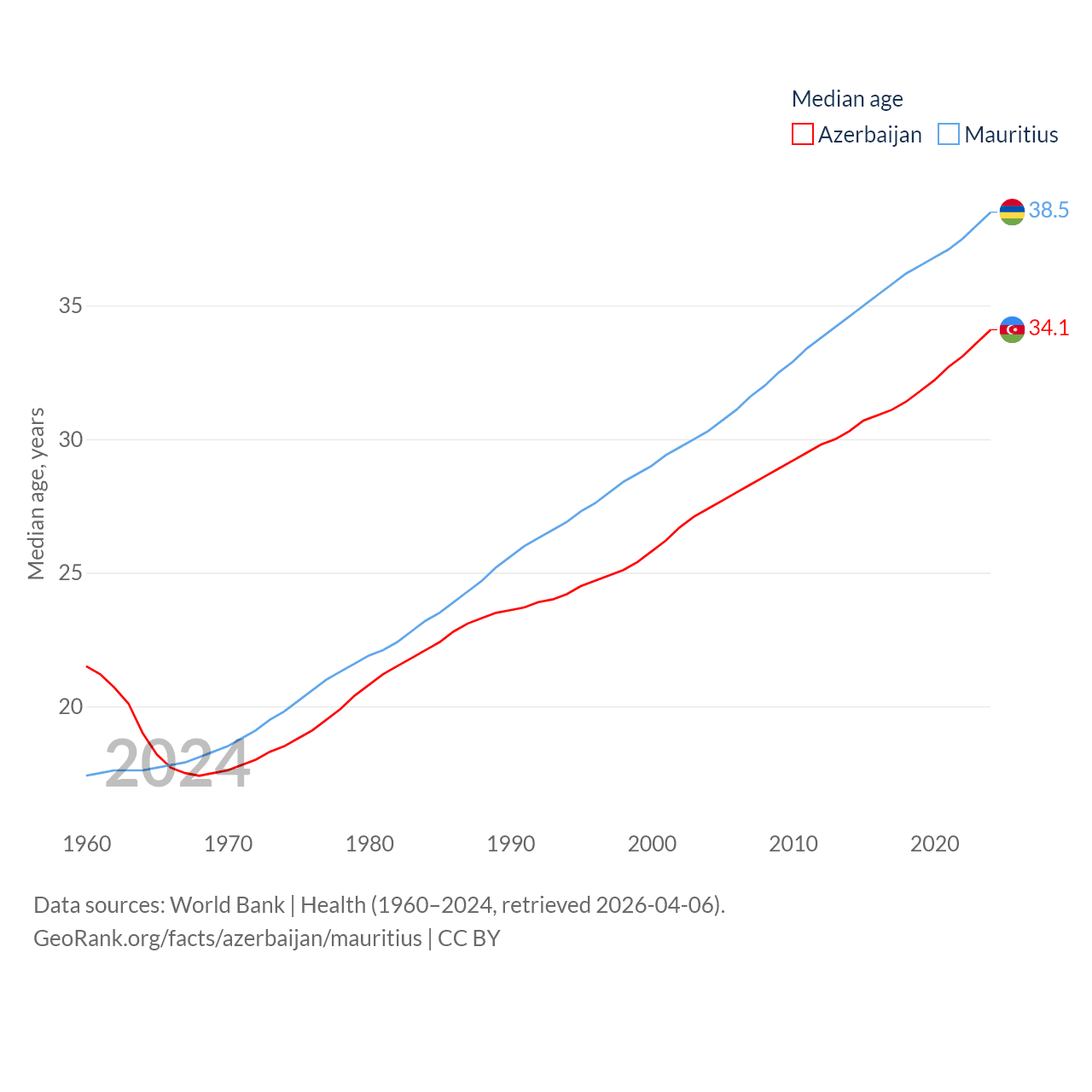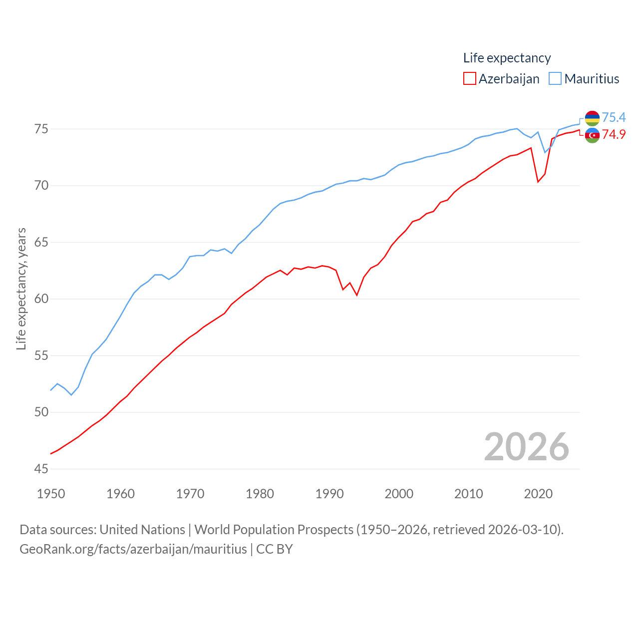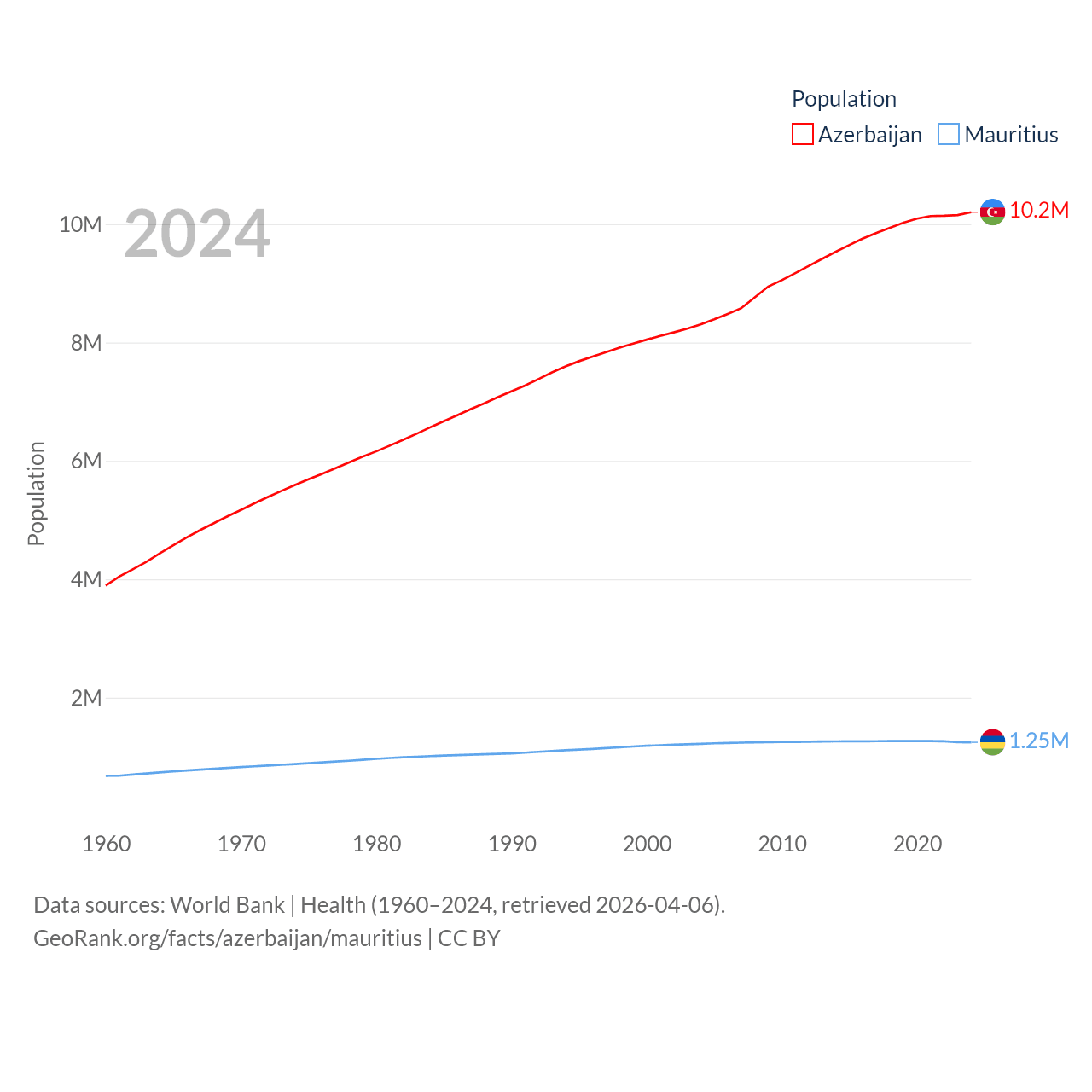Azerbaijan has a population of 10.2M (ranked 95/197), compared with 1.25M in Mauritius (ranked 156/197). Azerbaijan's land area is 31,911 sq mi versus 771 sq mi for Mauritius (ranked 112th vs. 170th).