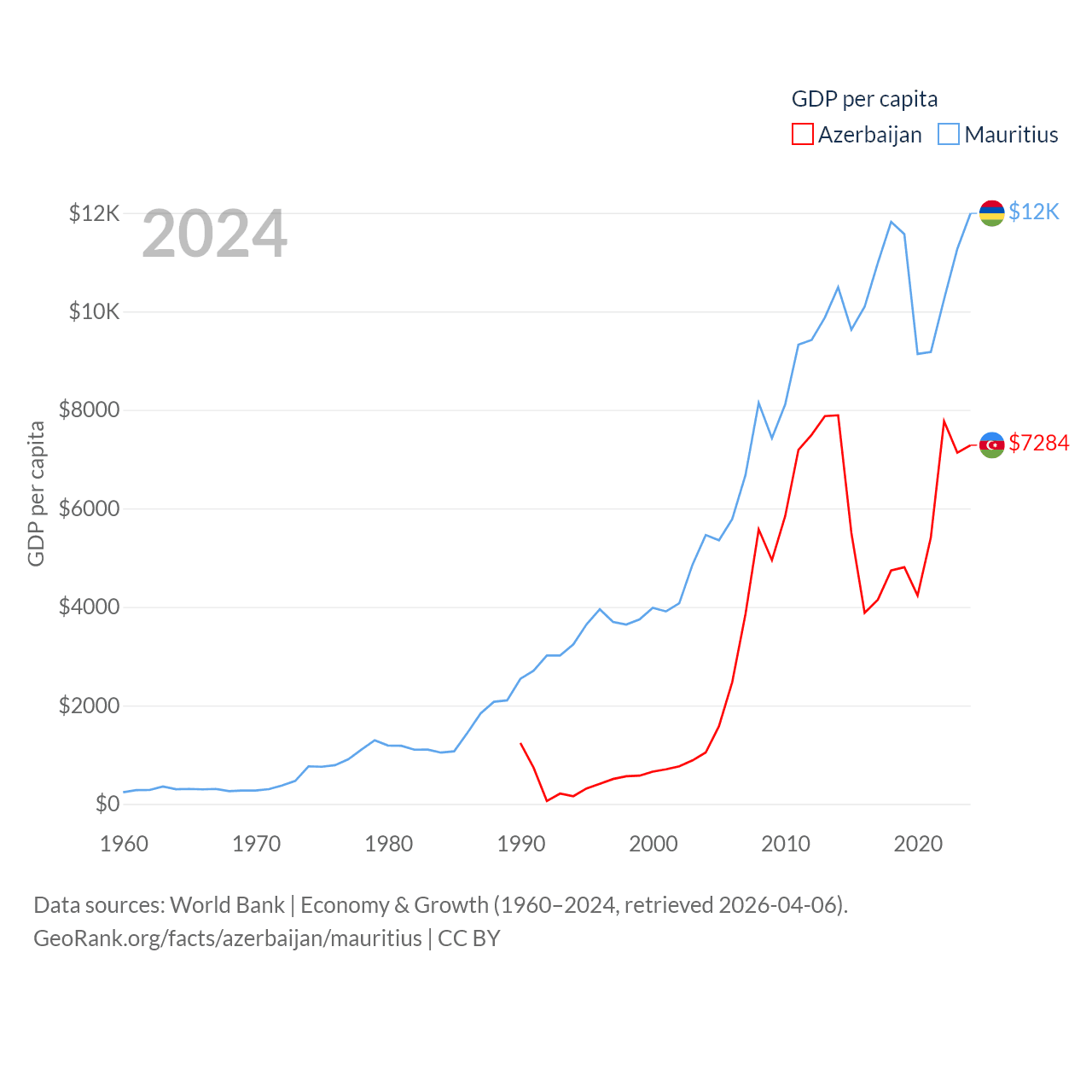 By GDP, Azerbaijan ranks 84/197 ($74.3B) and Mauritius ranks 143/197 ($14.9B). By GDP per capita, Azerbaijan ranks 101/197 ($7,284), while Mauritius ranks 78/197 ($11,991).