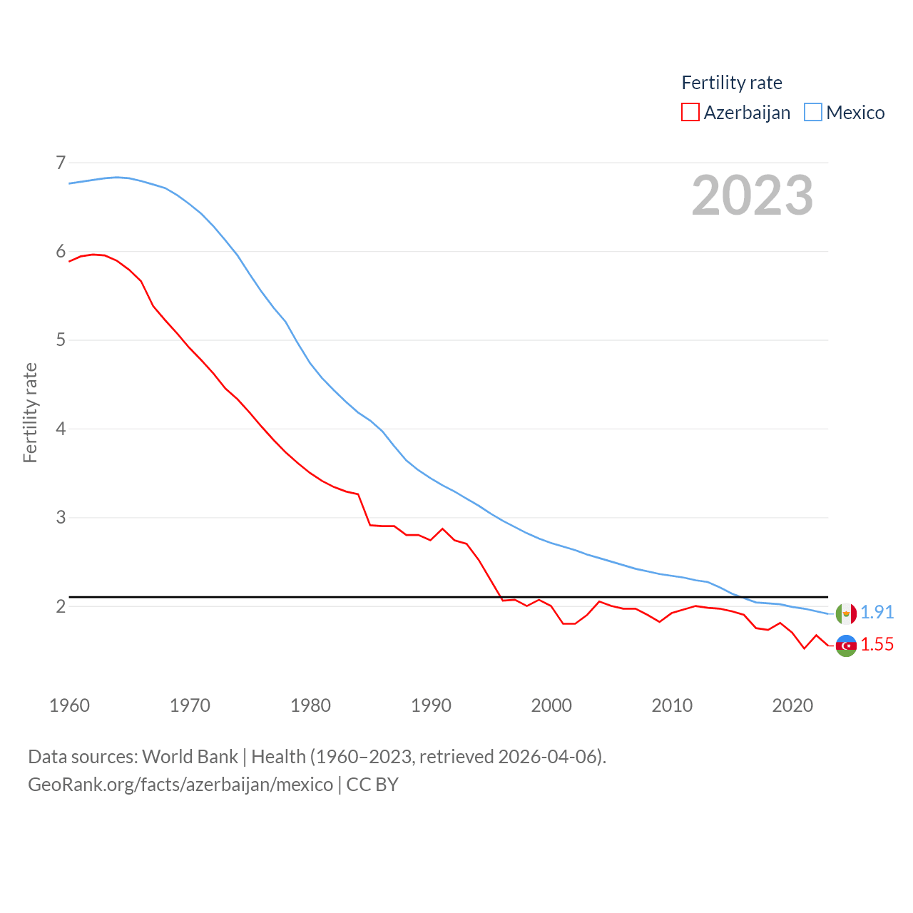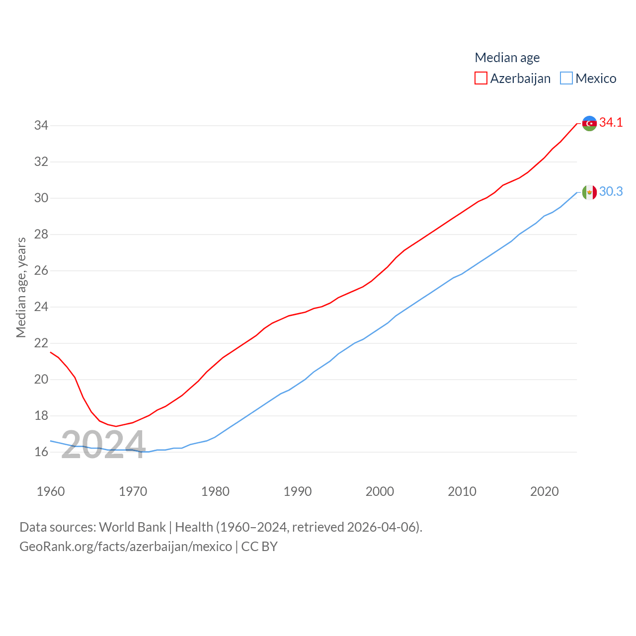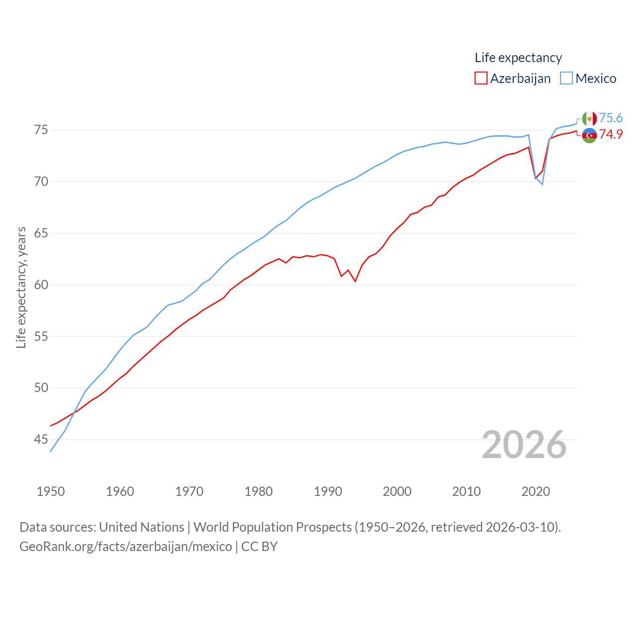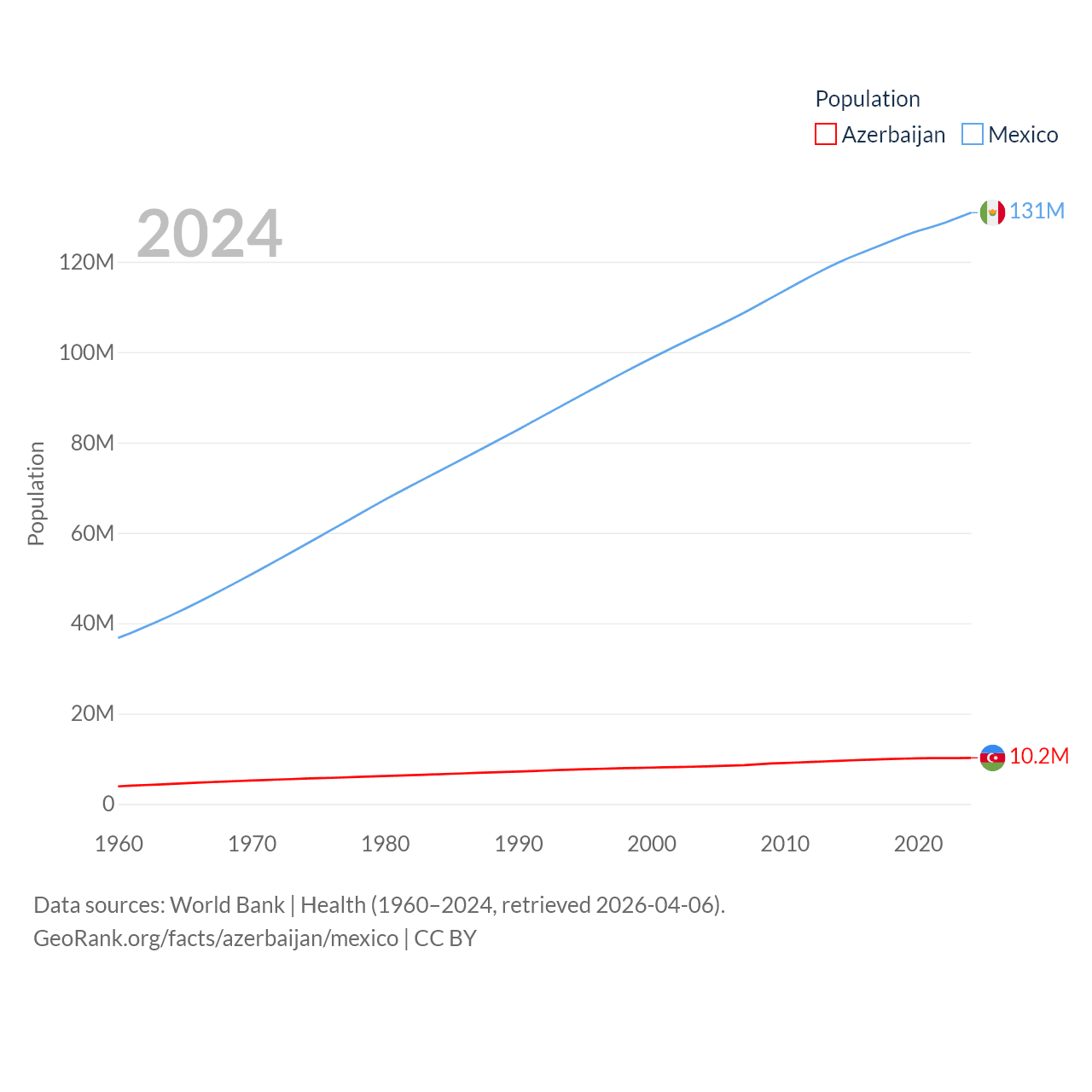 Azerbaijan has a population of 10.2M (ranked 95/197), compared with 131M in Mexico (ranked 11/197). Azerbaijan's land area is 31,911 sq mi versus 750,563 sq mi for Mexico (ranked 112th vs. 13th).