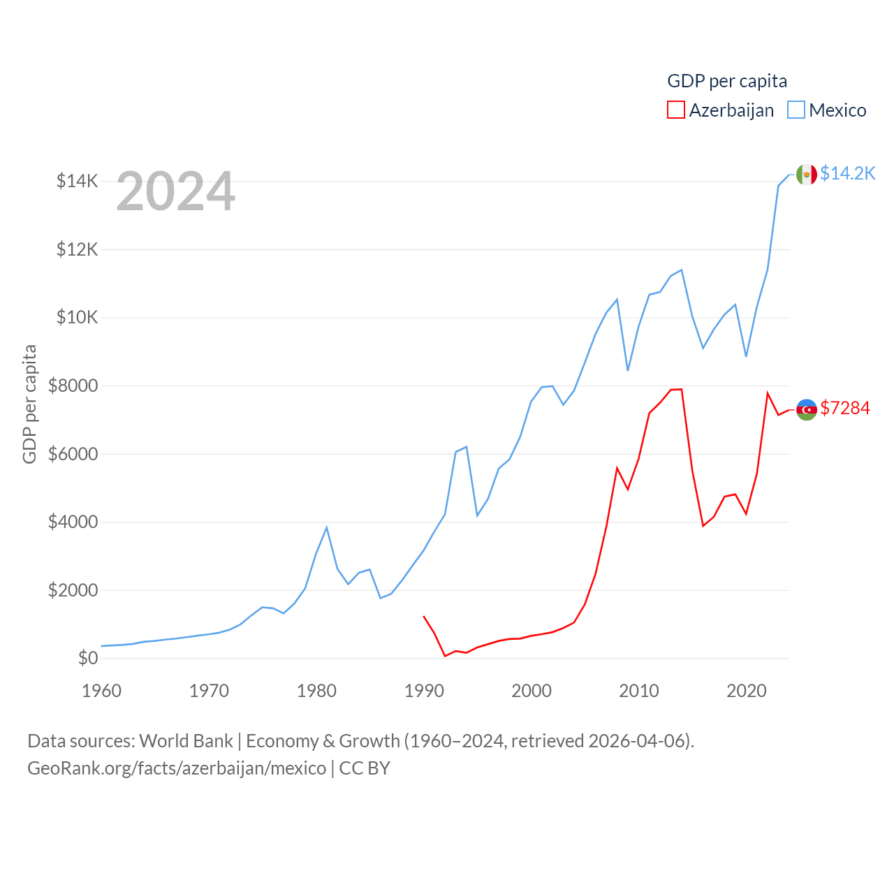 By GDP, Azerbaijan ranks 84/197 ($74.3B) and Mexico ranks 13/197 ($1.86T). By GDP per capita, Azerbaijan ranks 101/197 ($7,284), while Mexico ranks 69/197 ($14,186).