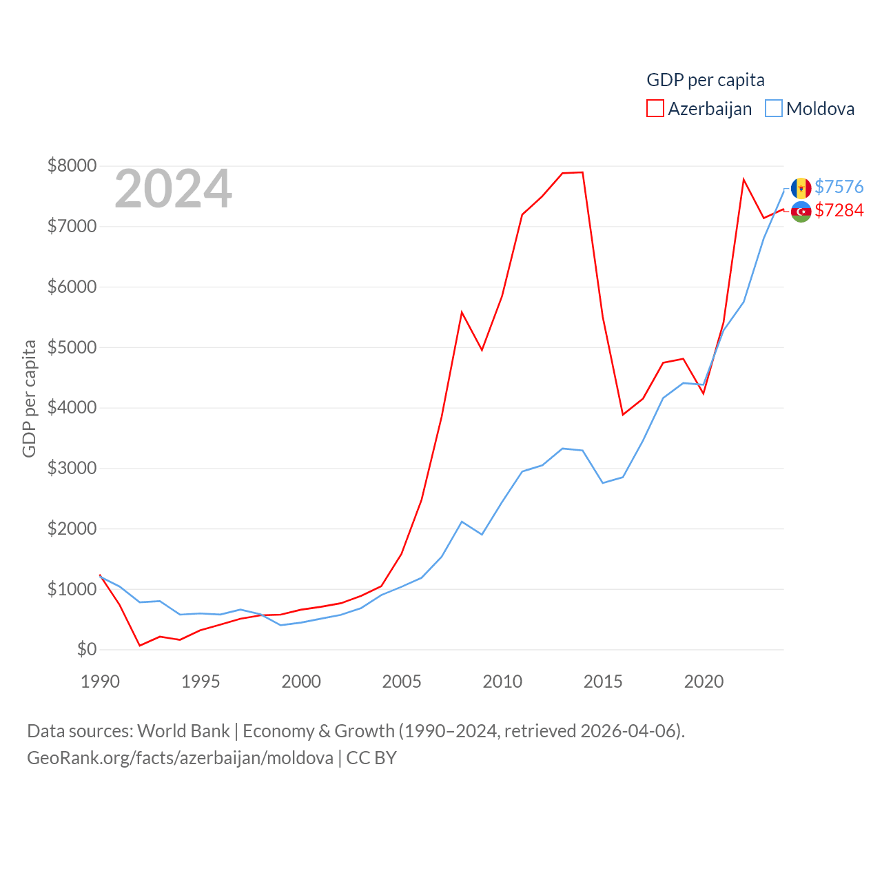By GDP, Azerbaijan ranks 84/197 ($74.3B) and Moldova ranks 134/197 ($18.2B). By GDP per capita, Azerbaijan ranks 101/197 ($7,284), while Moldova ranks 99/197 ($7,576).