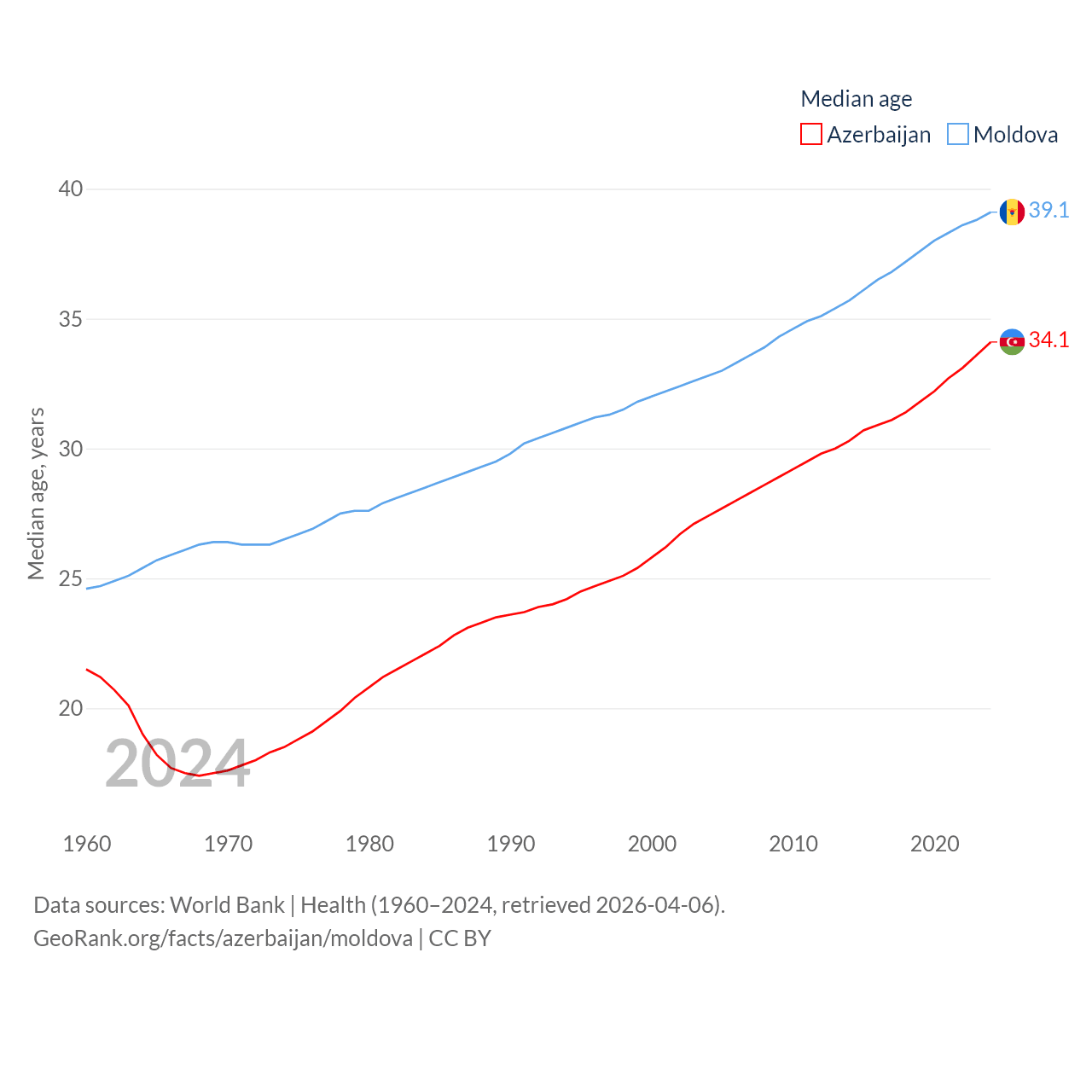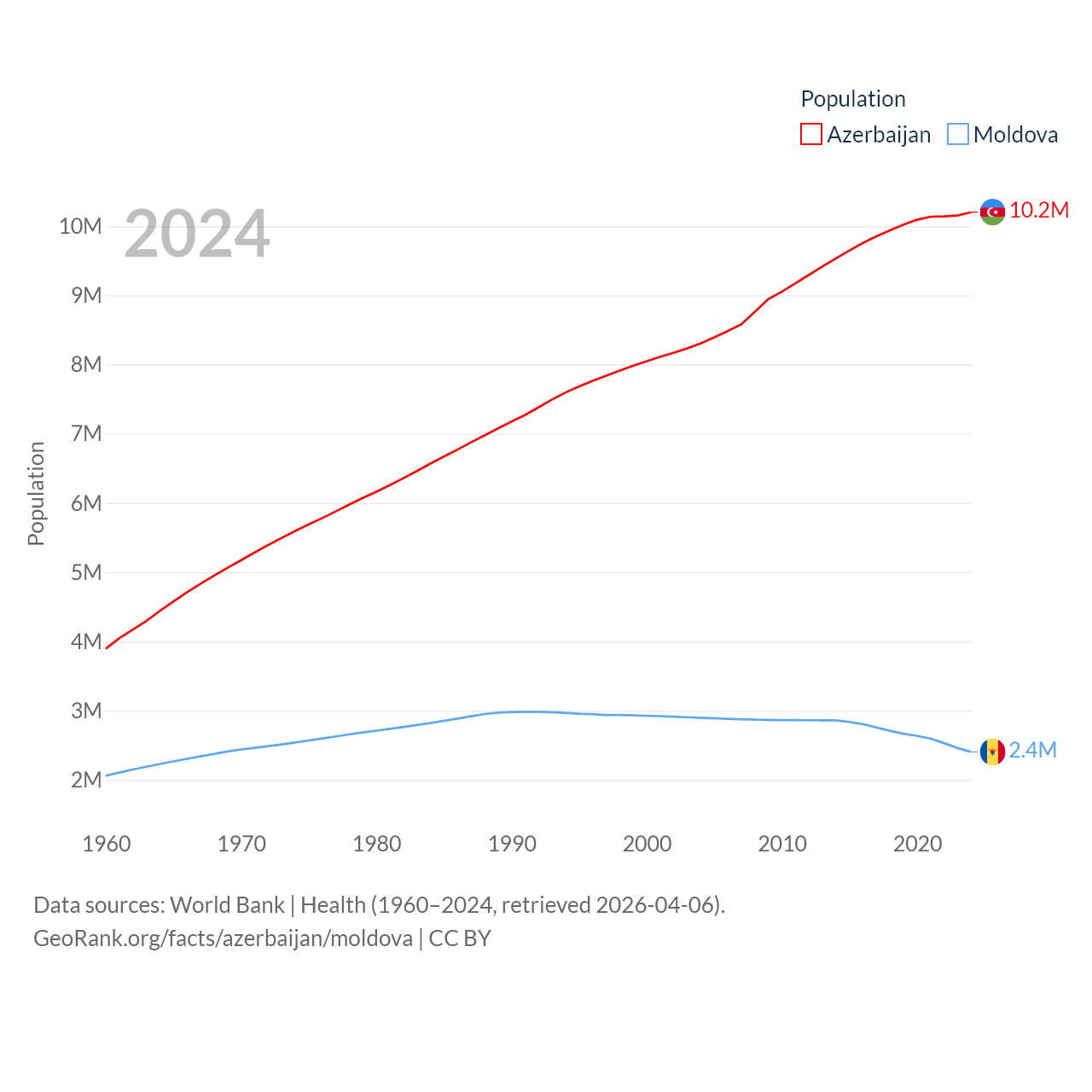 Azerbaijan has a population of 10.2M (ranked 95/197), compared with 2.4M in Moldova (ranked 143/197). Azerbaijan's land area is 31,911 sq mi versus 12,714 sq mi for Moldova (ranked 112th vs. 135th).