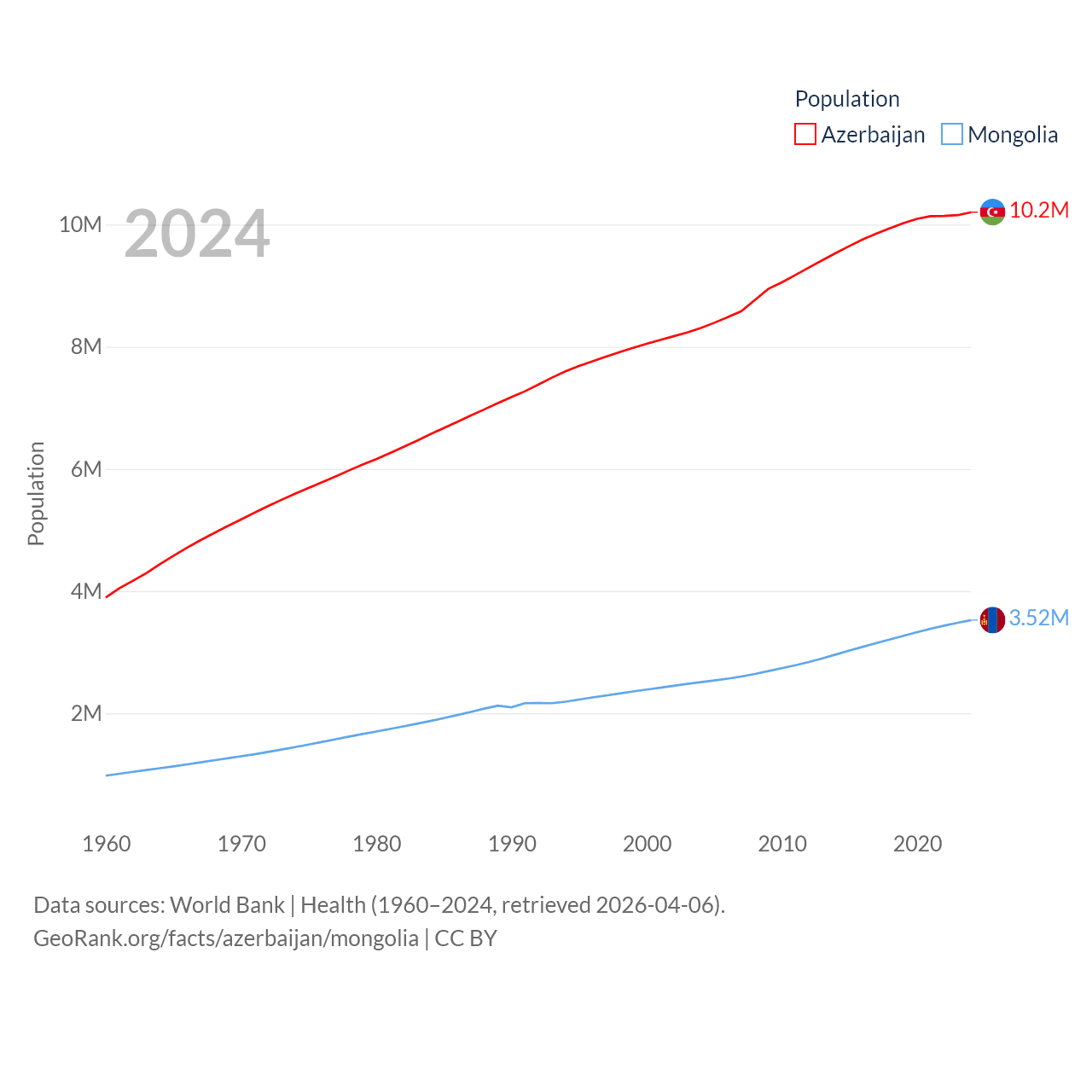 Azerbaijan has a population of 10.2M (ranked 95/197), compared with 3.52M in Mongolia (ranked 132/197). Azerbaijan's land area is 31,911 sq mi versus 601,740 sq mi for Mongolia (ranked 112th vs. 18th).