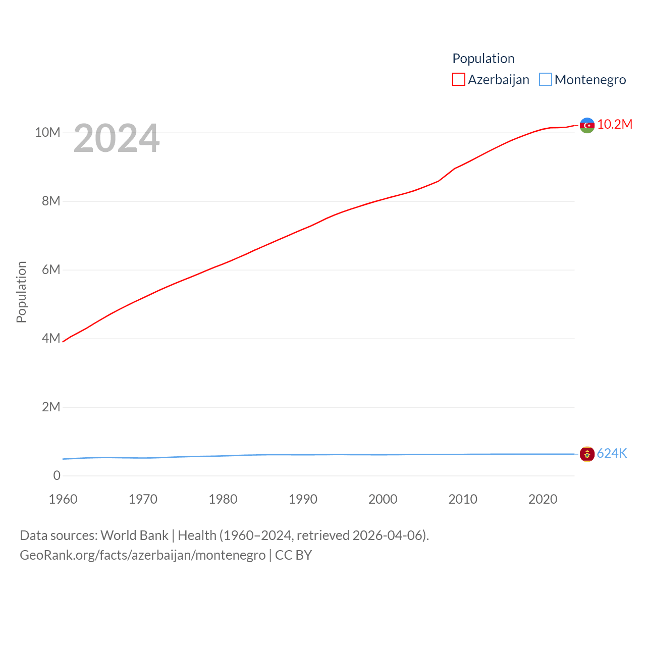 Azerbaijan has a population of 10.2M (ranked 95/197), compared with 624K in Montenegro (ranked 166/197). Azerbaijan's land area is 31,911 sq mi versus 5,193 sq mi for Montenegro (ranked 112th vs. 156th).