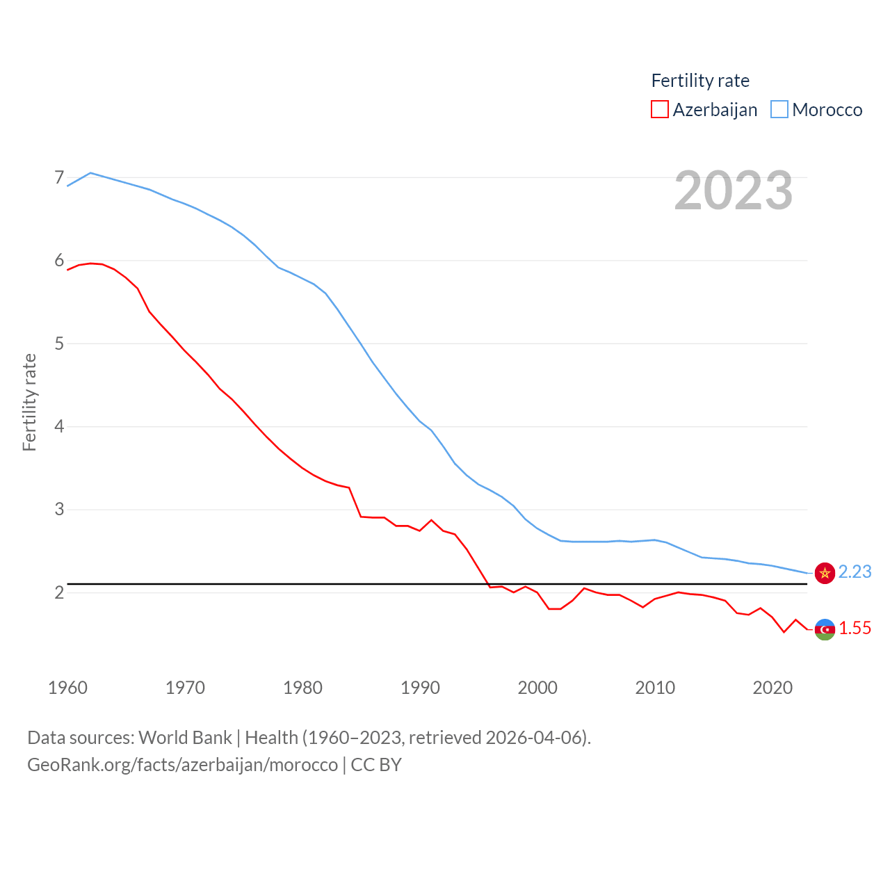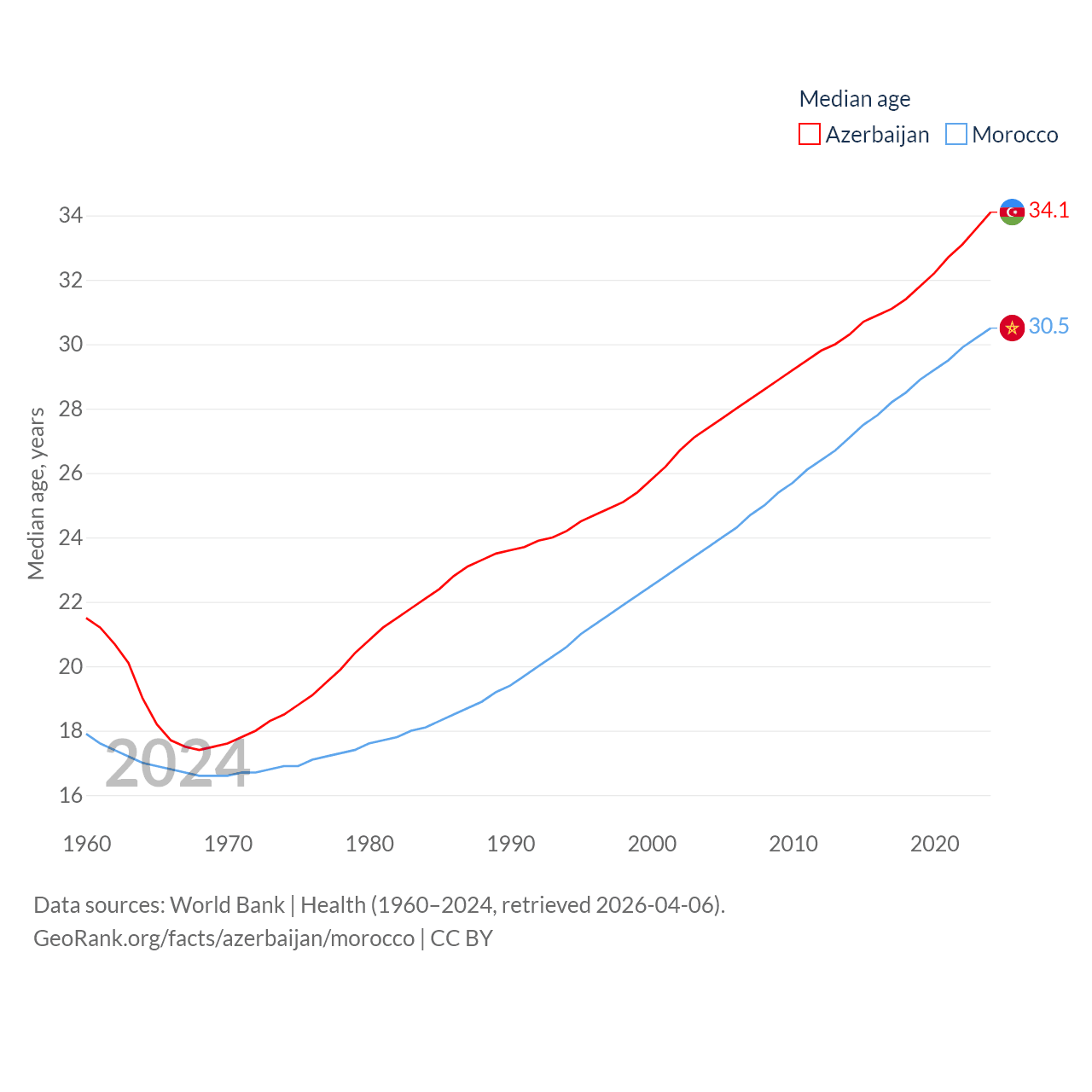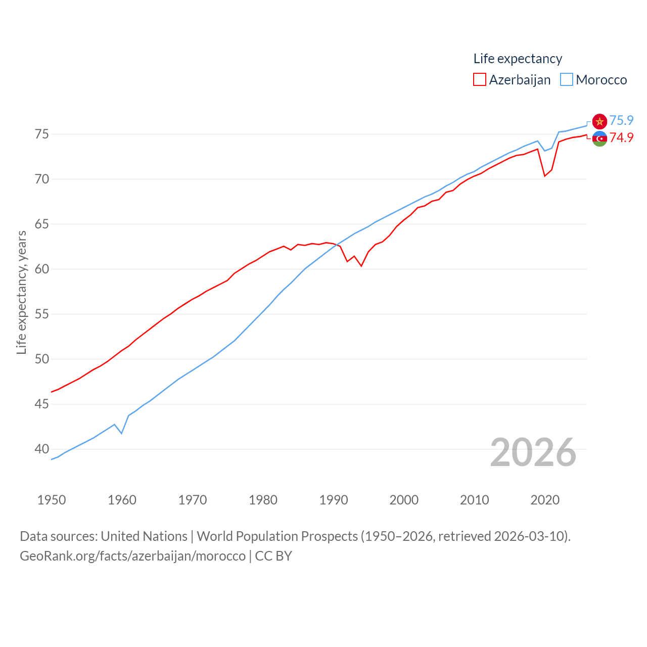 Azerbaijan has a population of 10.2M (ranked 95/197), compared with 38.1M in Morocco (ranked 39/197). Azerbaijan's land area is 31,911 sq mi versus 172,317 sq mi for Morocco (ranked 112th vs. 55th).