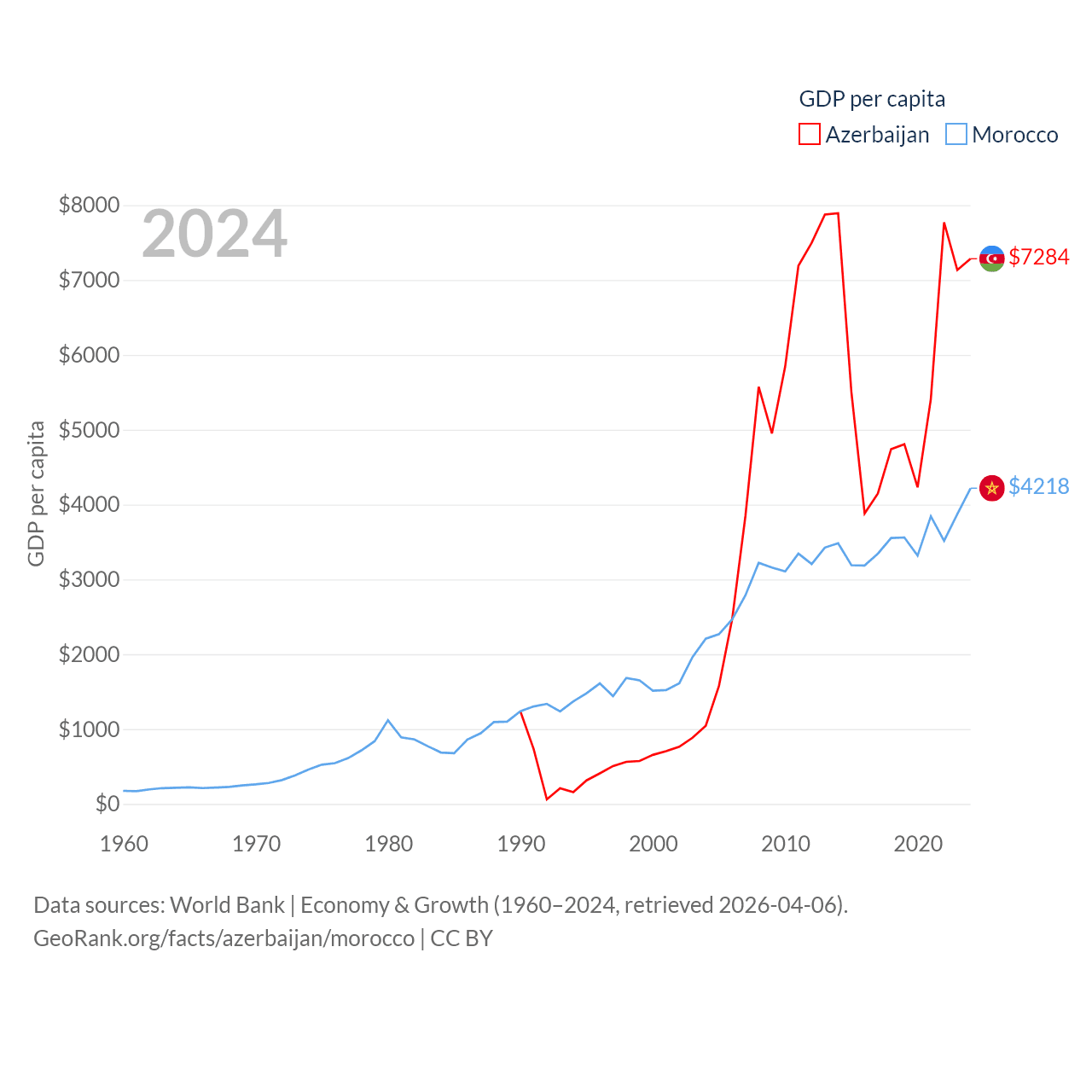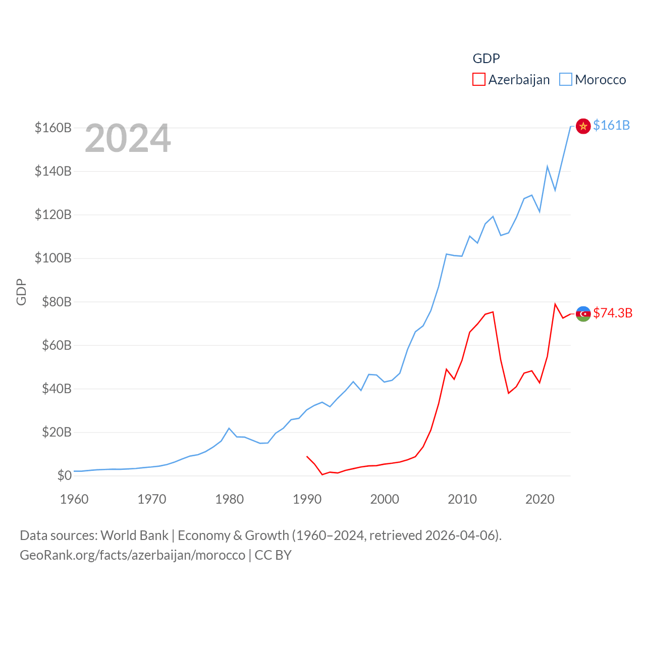 By GDP, Azerbaijan ranks 84/197 ($74.3B) and Morocco ranks 58/197 ($161B). By GDP per capita, Azerbaijan ranks 101/197 ($7,284), while Morocco ranks 127/197 ($4,218).