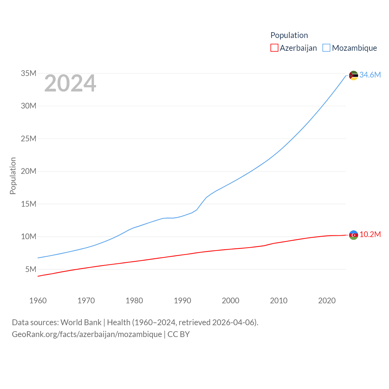 Azerbaijan has a population of 10.2M (ranked 95/197), compared with 34.6M in Mozambique (ranked 46/197). Azerbaijan's land area is 31,911 sq mi versus 303,623 sq mi for Mozambique (ranked 112th vs. 34th).