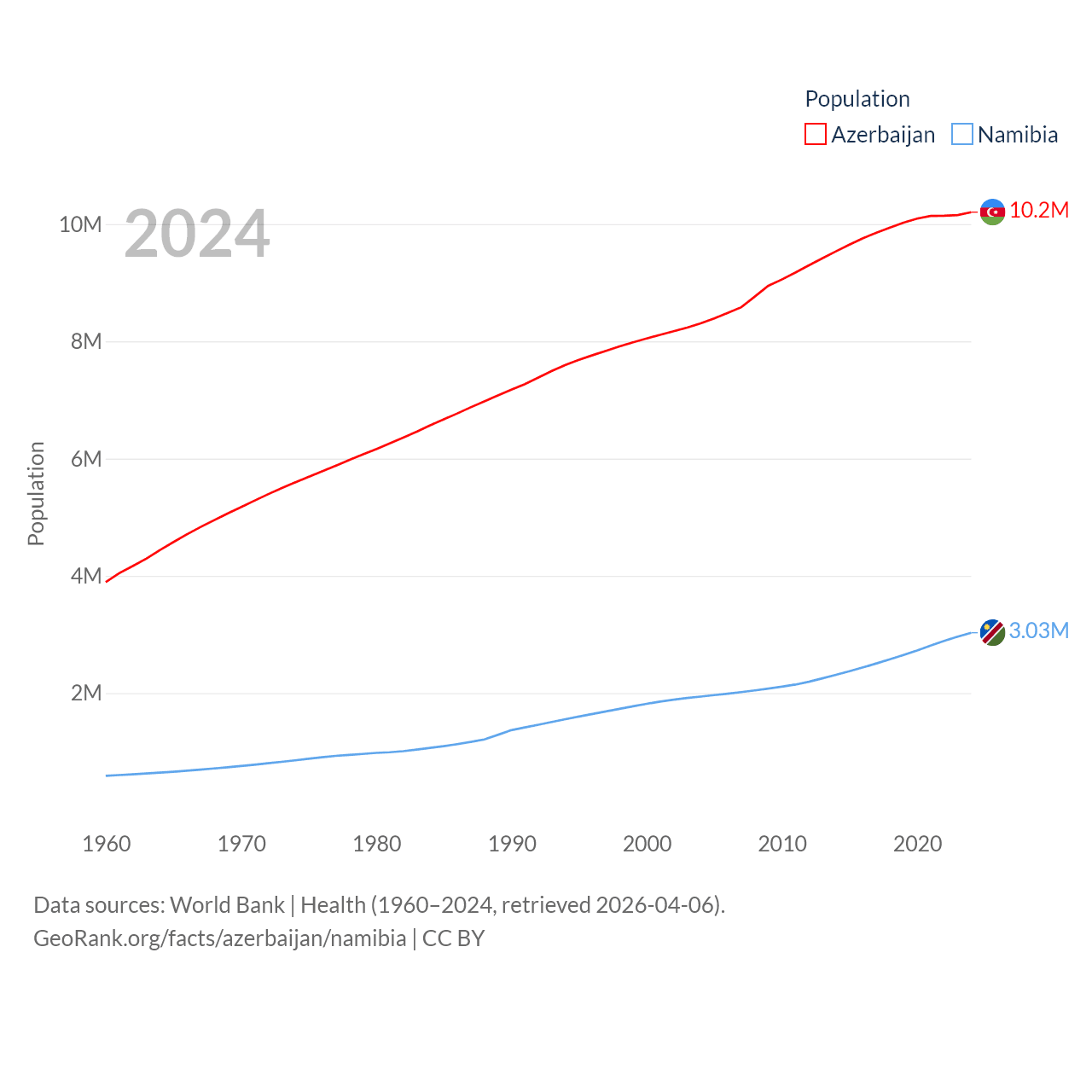 Azerbaijan has a population of 10.2M (ranked 95/197), compared with 3.03M in Namibia (ranked 136/197). Azerbaijan's land area is 31,911 sq mi versus 317,874 sq mi for Namibia (ranked 112th vs. 33rd).