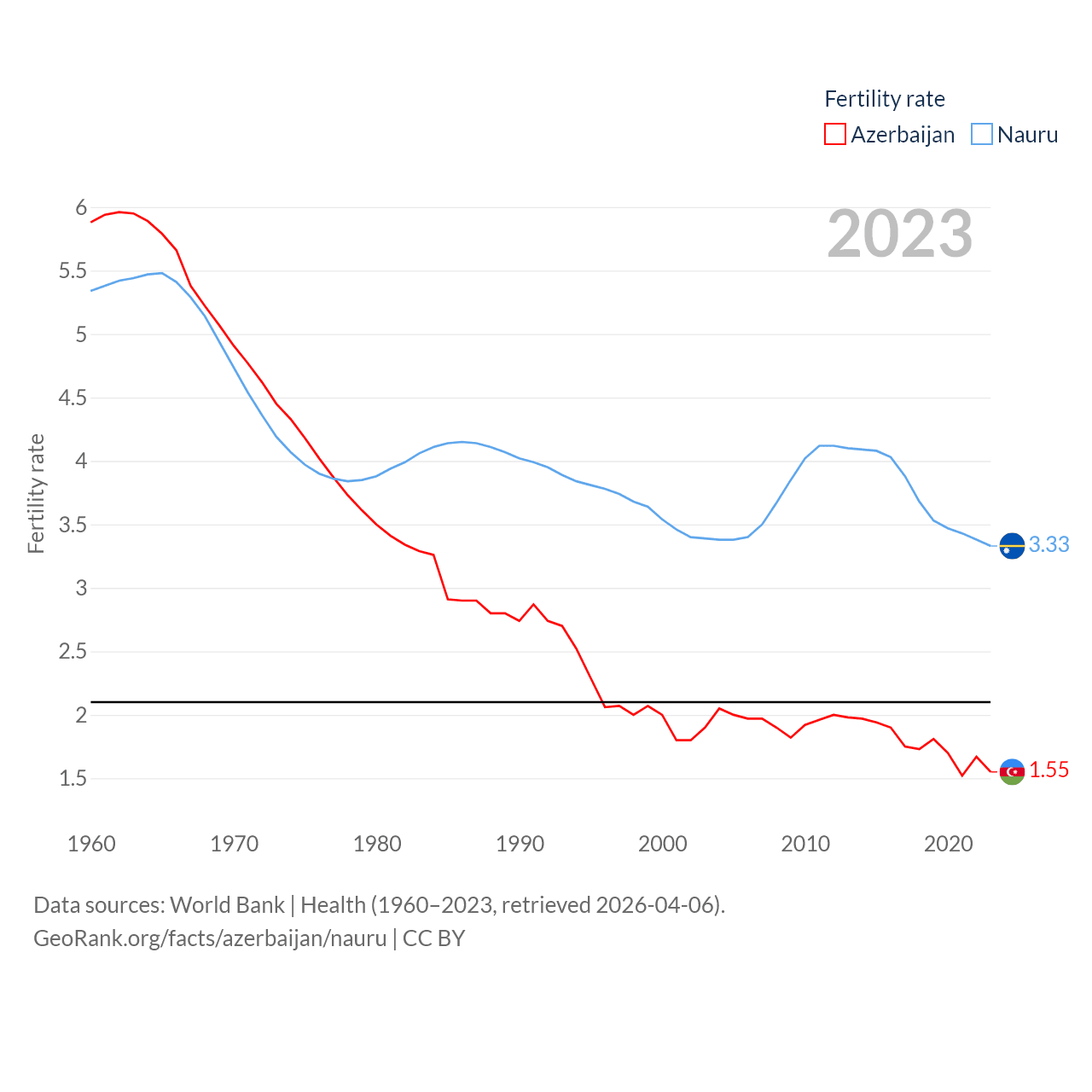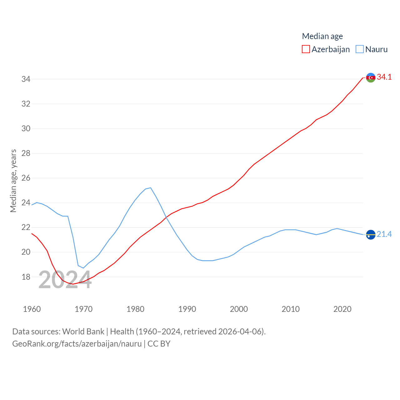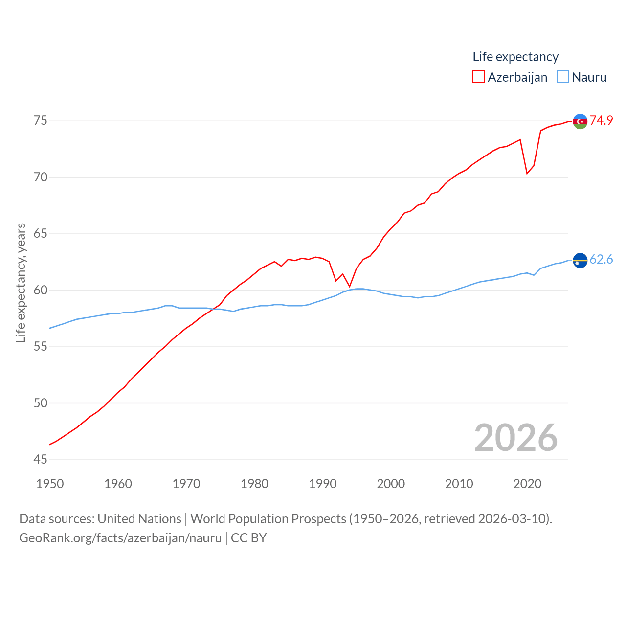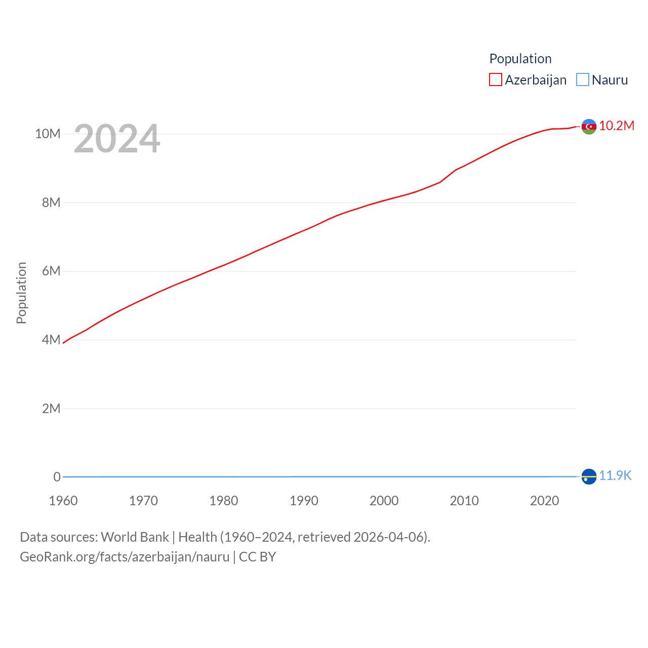 Azerbaijan has a population of 10.2M (ranked 95/197), compared with 11.9K in Nauru (ranked 195/197). Azerbaijan's land area is 31,911 sq mi versus 7.72 sq mi for Nauru (ranked 112th vs. 195th).