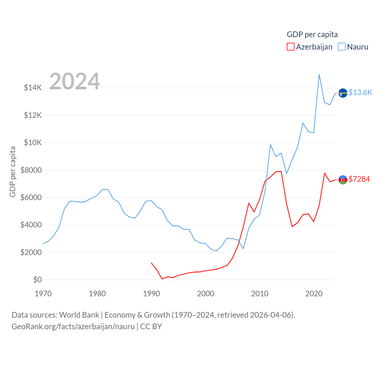 By GDP, Azerbaijan ranks 84/197 ($74.3B) and Nauru ranks 195/197 ($163M). By GDP per capita, Azerbaijan ranks 101/197 ($7,284), while Nauru ranks 74/197 ($13,609).