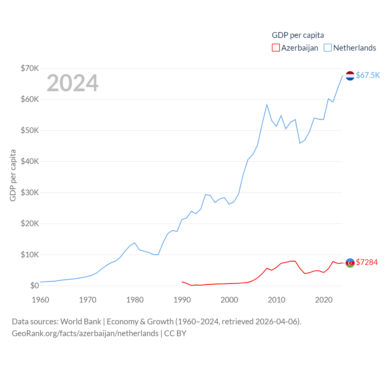 By GDP, Azerbaijan ranks 84/197 ($74.3B) and The Netherlands ranks 19/197 ($1.21T). By GDP per capita, Azerbaijan ranks 101/197 ($7,284), while The Netherlands ranks 13/197 ($67,520).
