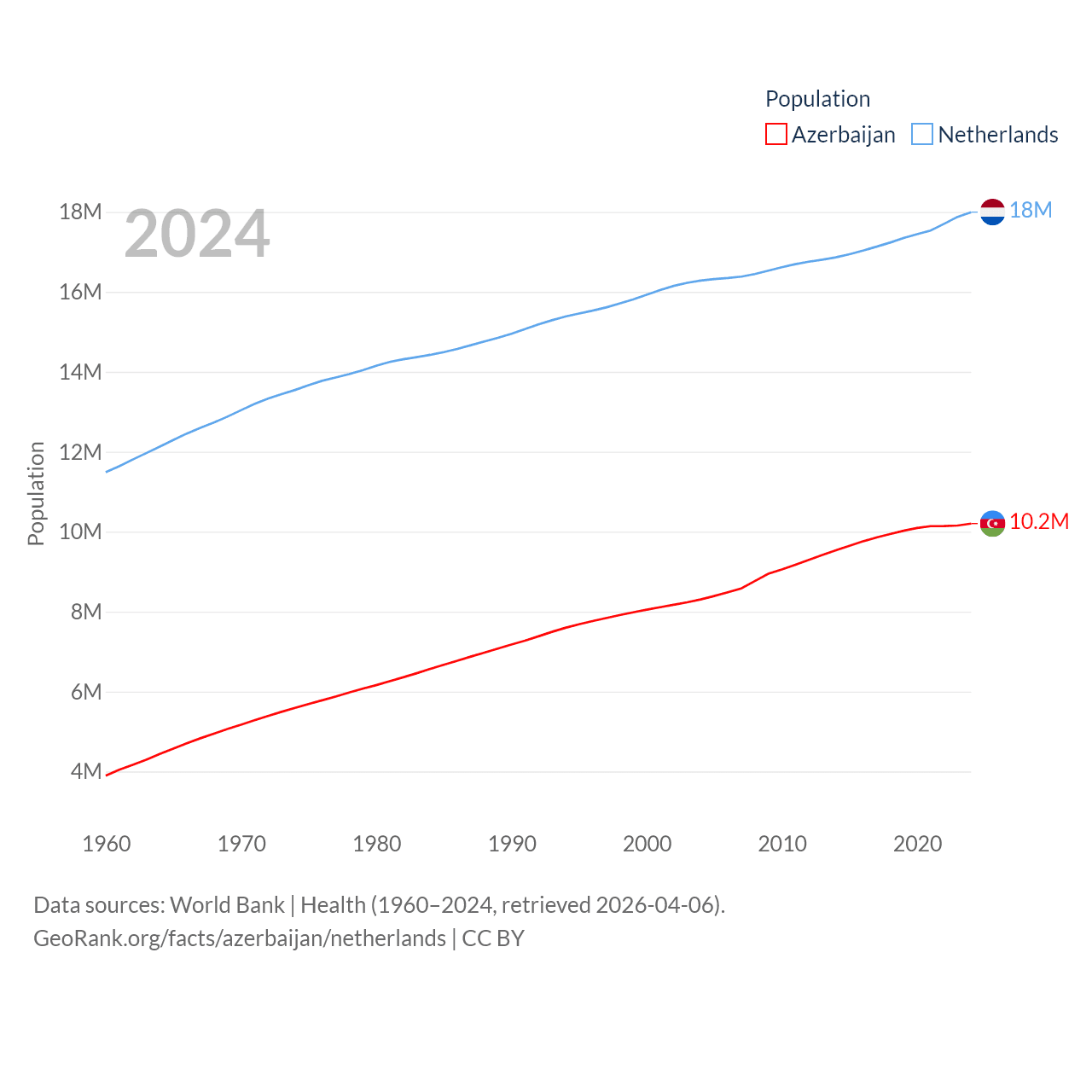 Azerbaijan has a population of 10.2M (ranked 95/197), compared with 18M in The Netherlands (ranked 72/197). Azerbaijan's land area is 31,911 sq mi versus 13,000 sq mi for The Netherlands (ranked 112th vs. 134th).