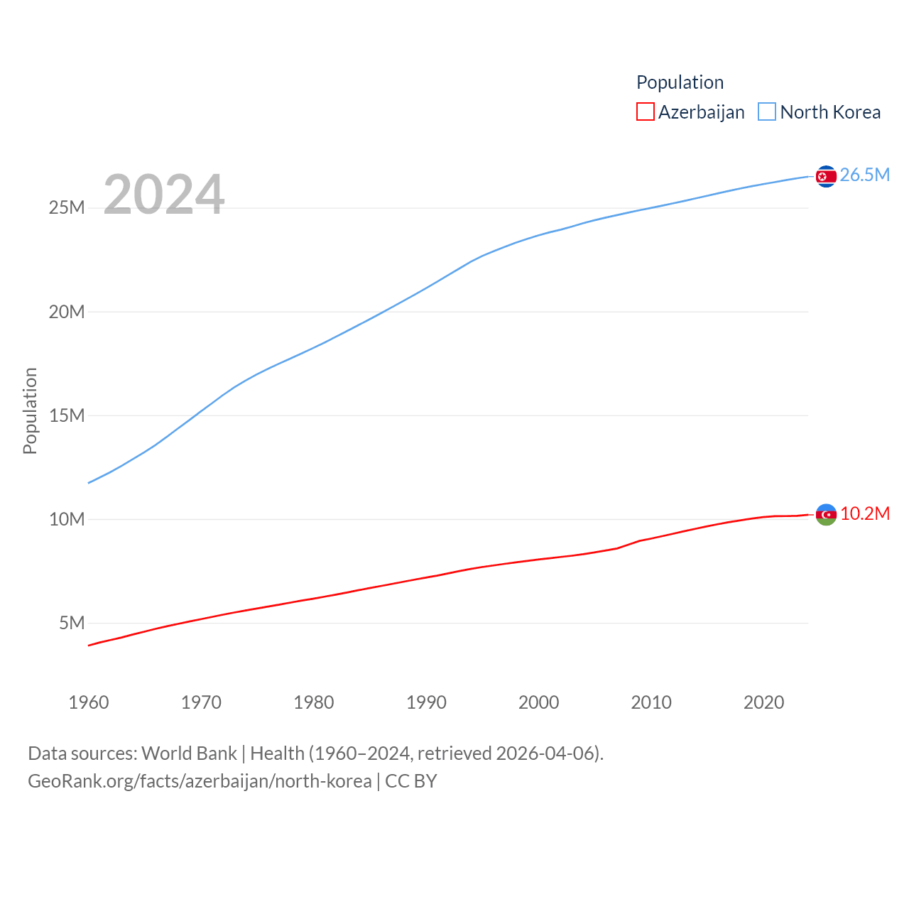 Azerbaijan has a population of 10.2M (ranked 95/197), compared with 26.5M in North Korea (ranked 56/197). Azerbaijan's land area is 31,911 sq mi versus 46,491 sq mi for North Korea (ranked 112th vs. 97th).