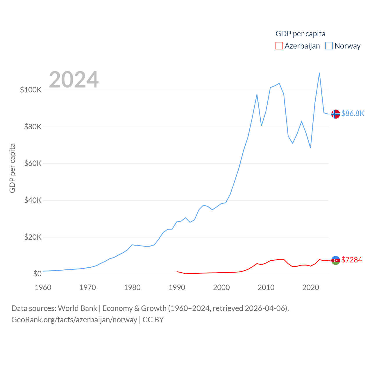 By GDP, Azerbaijan ranks 84/197 ($74.3B) and Norway ranks 32/197 ($484B). By GDP per capita, Azerbaijan ranks 101/197 ($7,284), while Norway ranks 8/197 ($86,785).