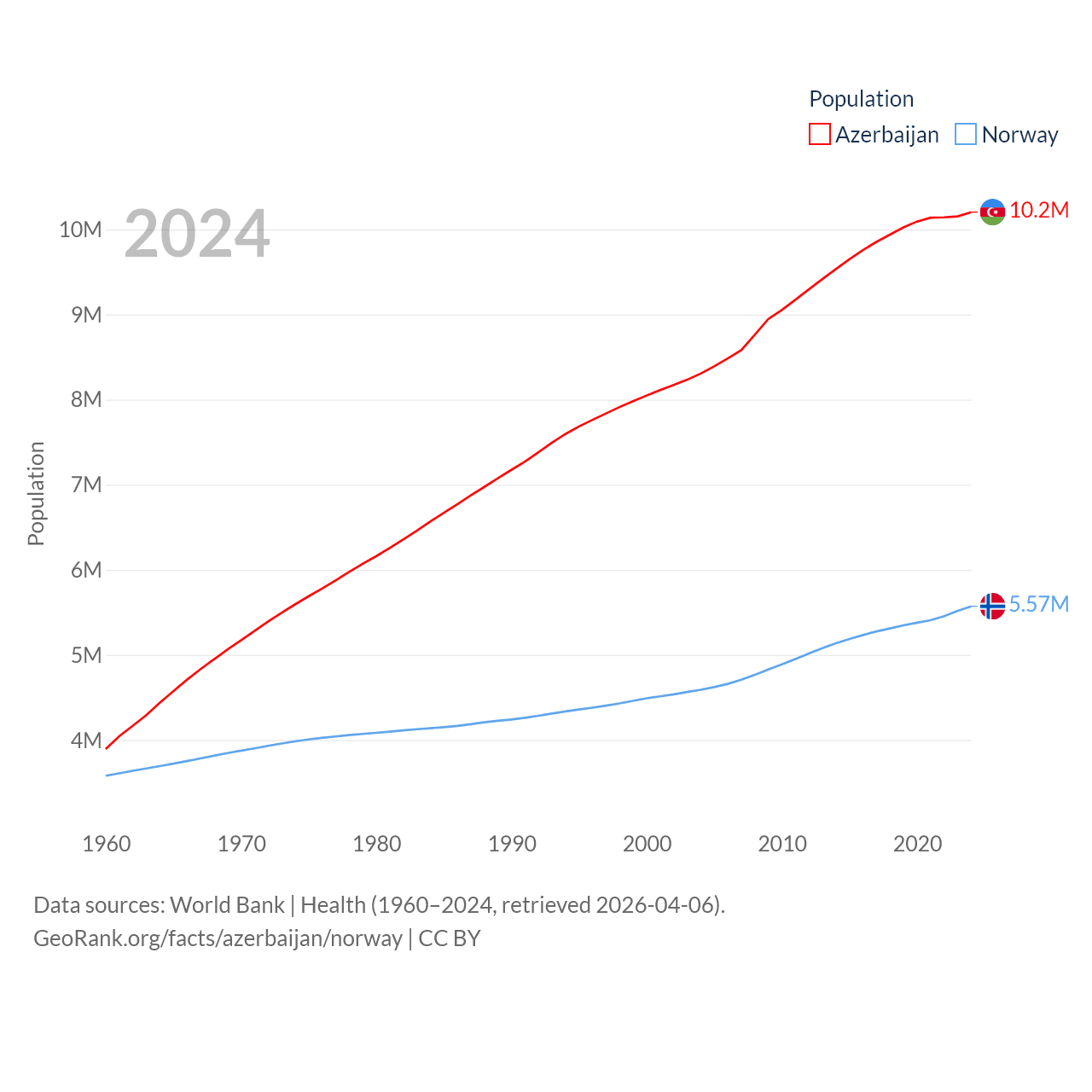 Azerbaijan has a population of 10.2M (ranked 95/197), compared with 5.57M in Norway (ranked 118/197). Azerbaijan's land area is 31,911 sq mi versus 140,645 sq mi for Norway (ranked 112th vs. 62nd).