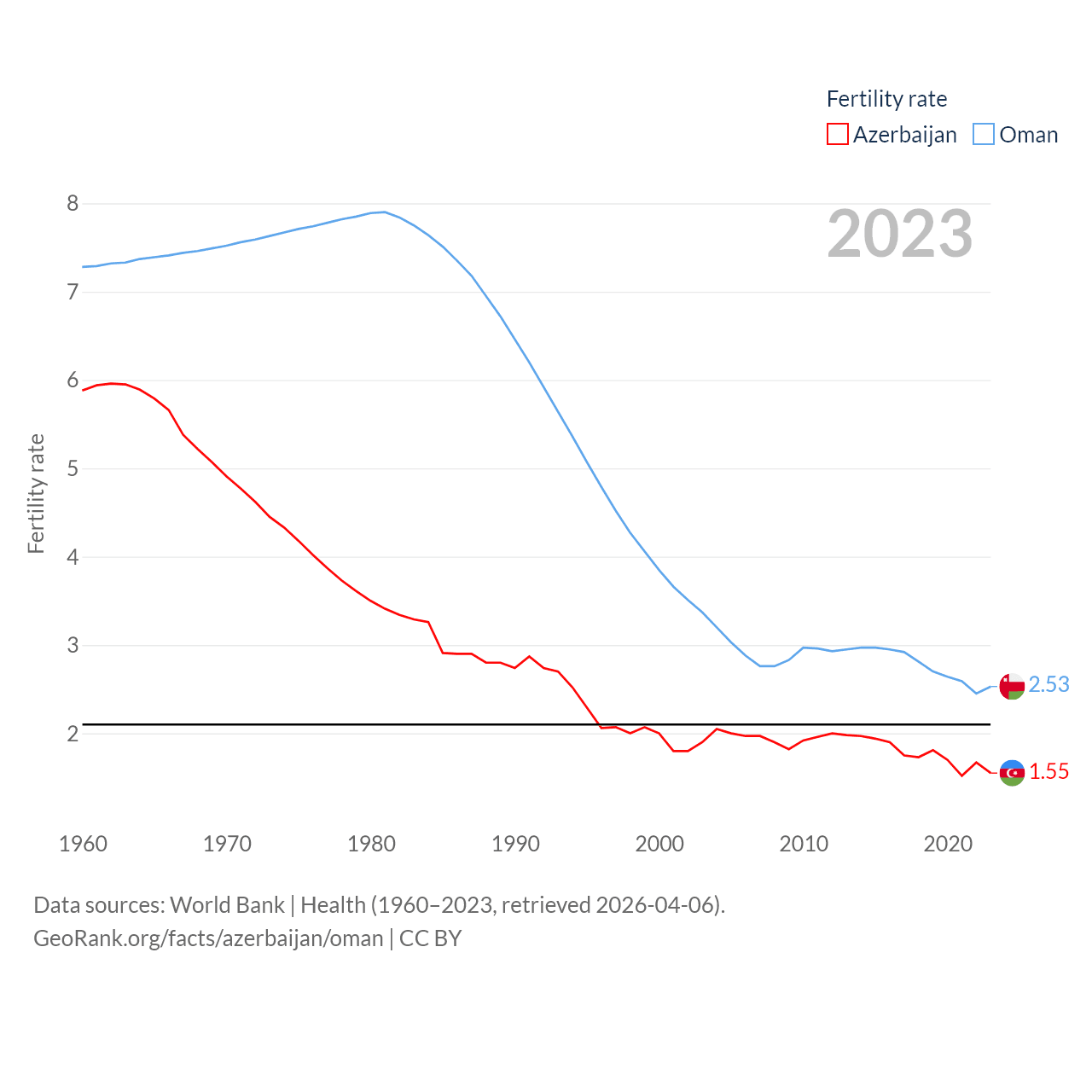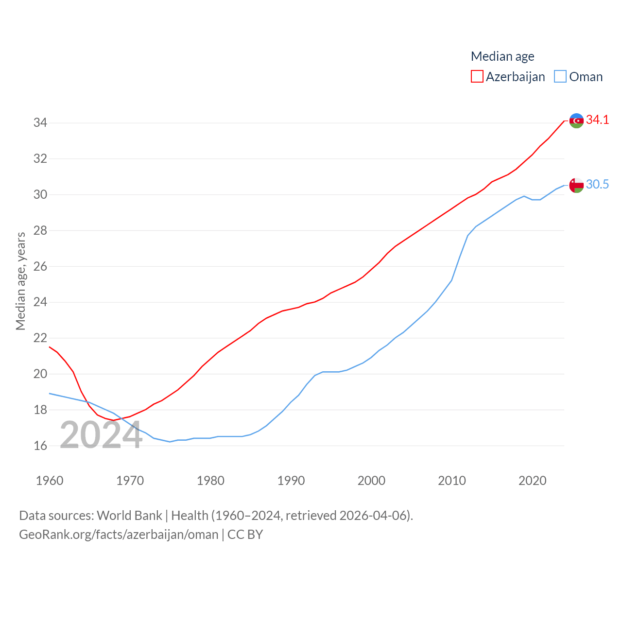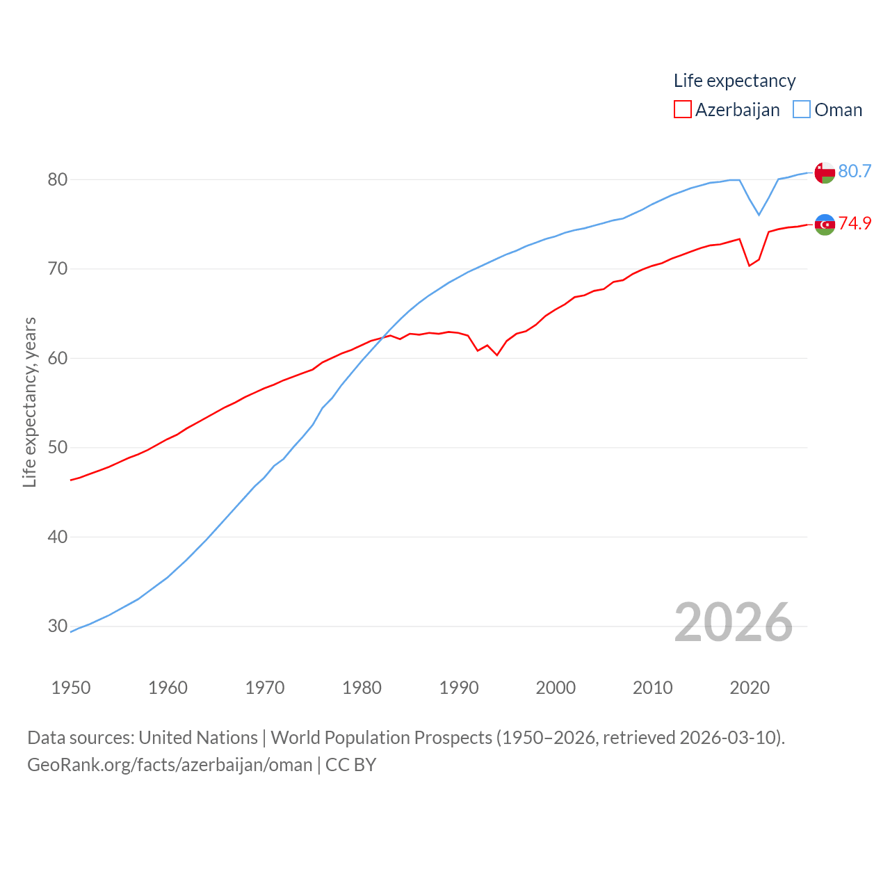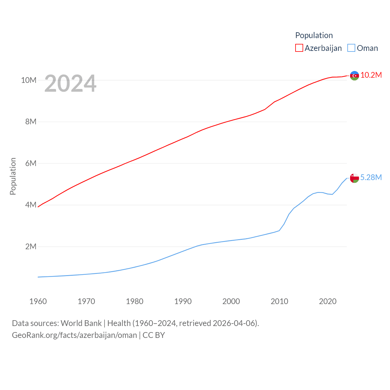 Azerbaijan has a population of 10.2M (ranked 95/197), compared with 5.28M in Oman (ranked 124/197). Azerbaijan's land area is 31,911 sq mi versus 119,499 sq mi for Oman (ranked 112th vs. 68th).