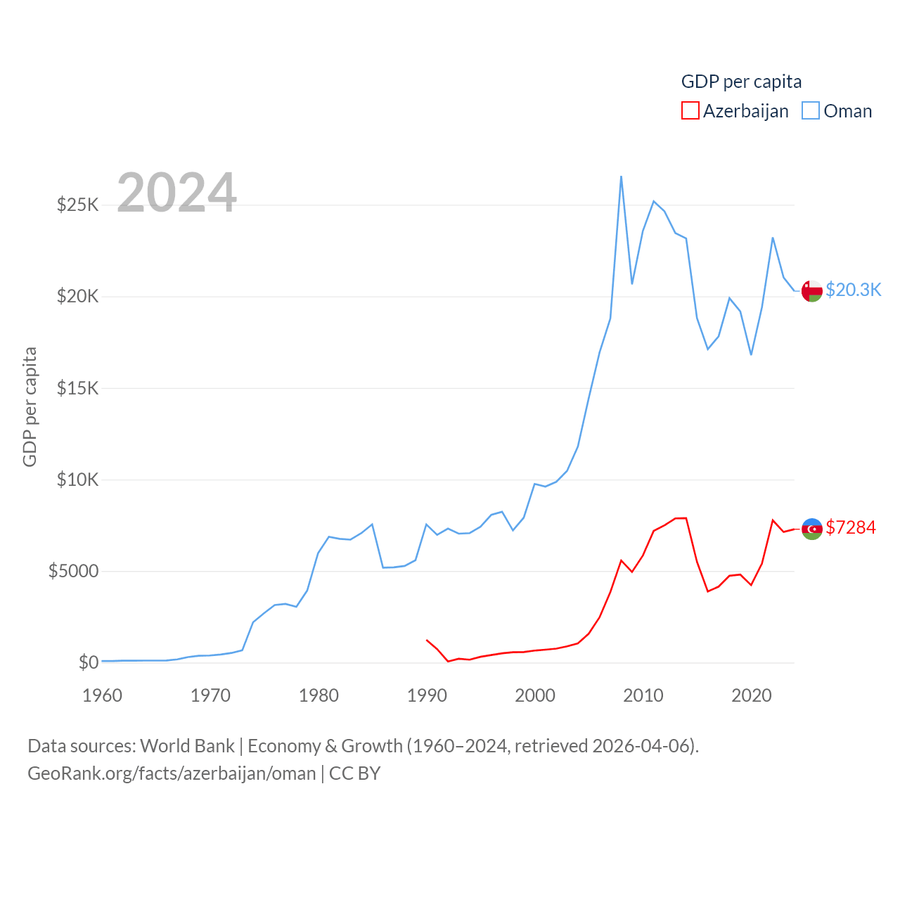 By GDP, Azerbaijan ranks 84/197 ($74.3B) and Oman ranks 70/197 ($107B). By GDP per capita, Azerbaijan ranks 101/197 ($7,284), while Oman ranks 57/197 ($20,285).