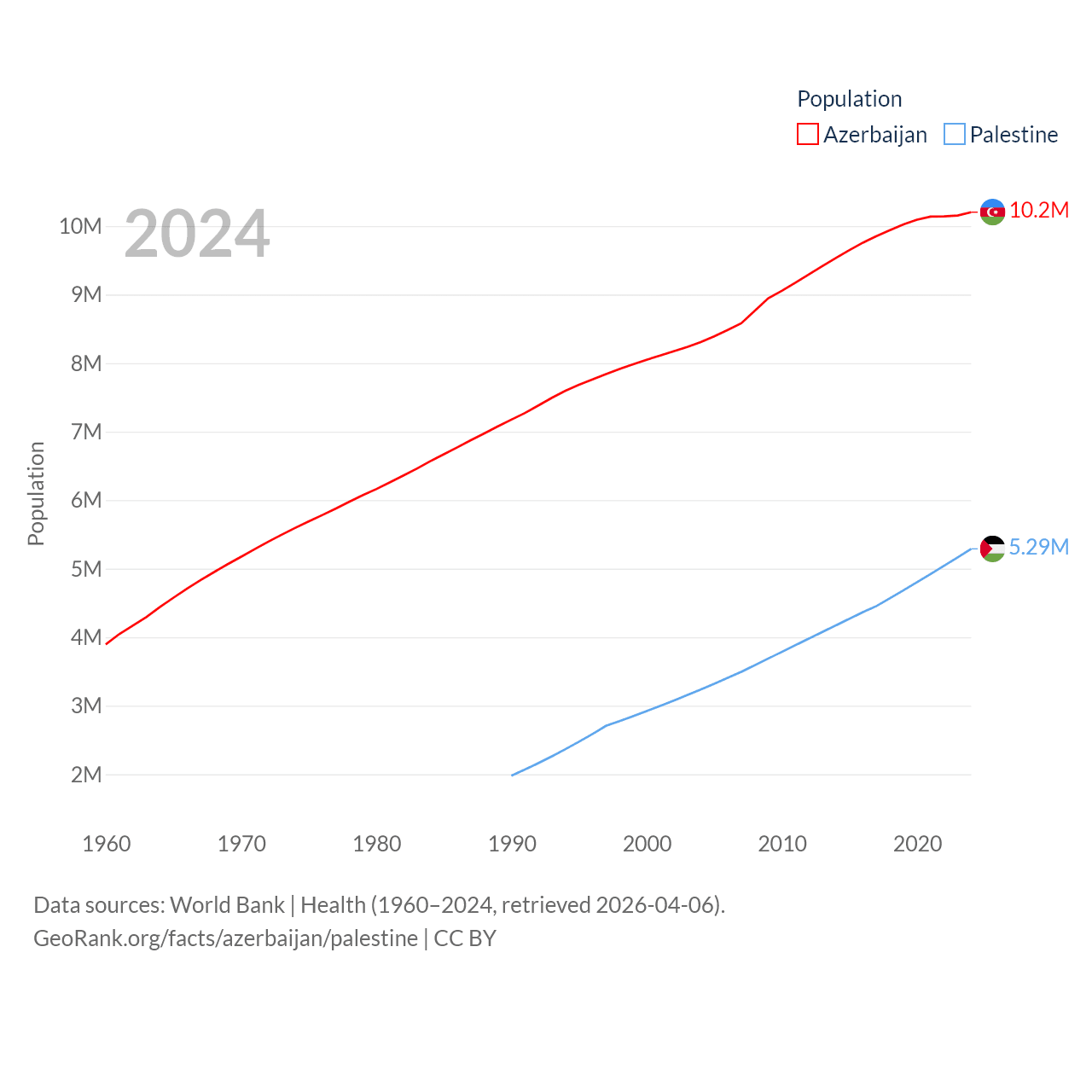 Azerbaijan has a population of 10.2M (ranked 95/197), compared with 5.29M in Palestine (ranked 122/197). Azerbaijan's land area is 31,911 sq mi versus 2,326 sq mi for Palestine (ranked 112th vs. 164th).