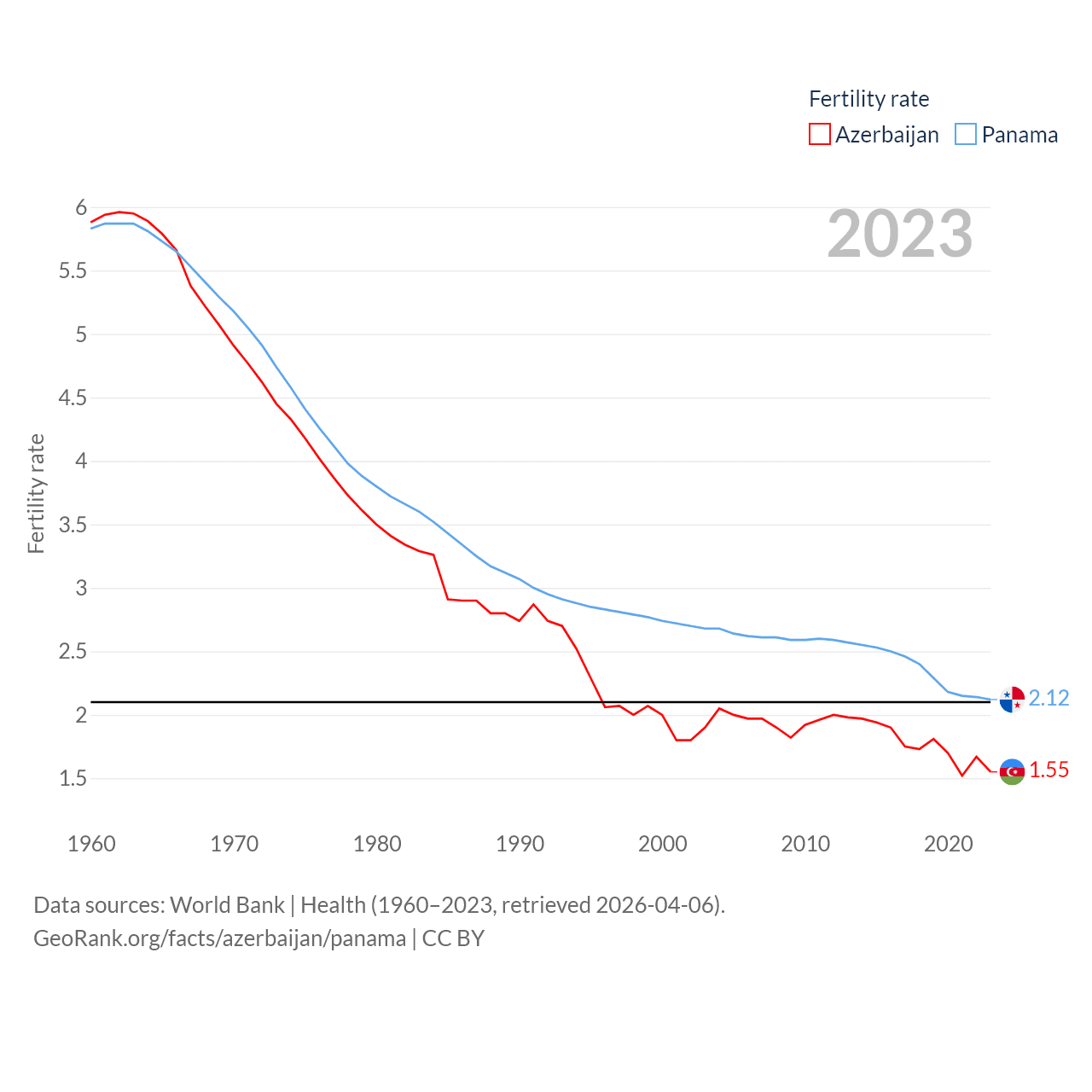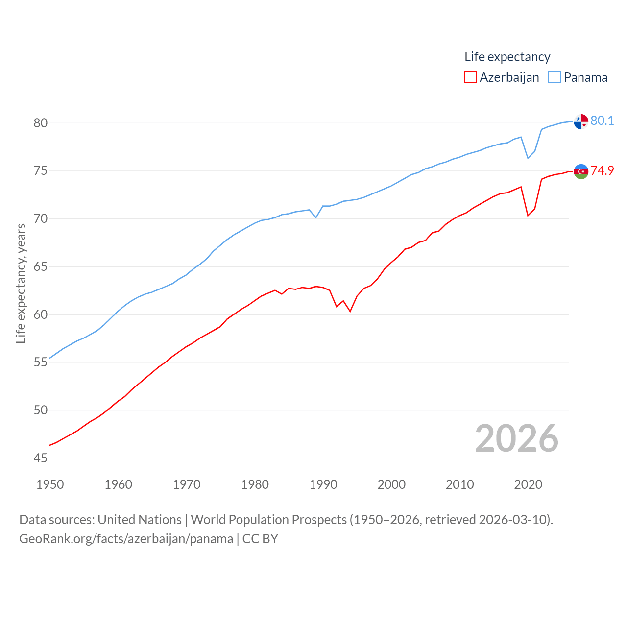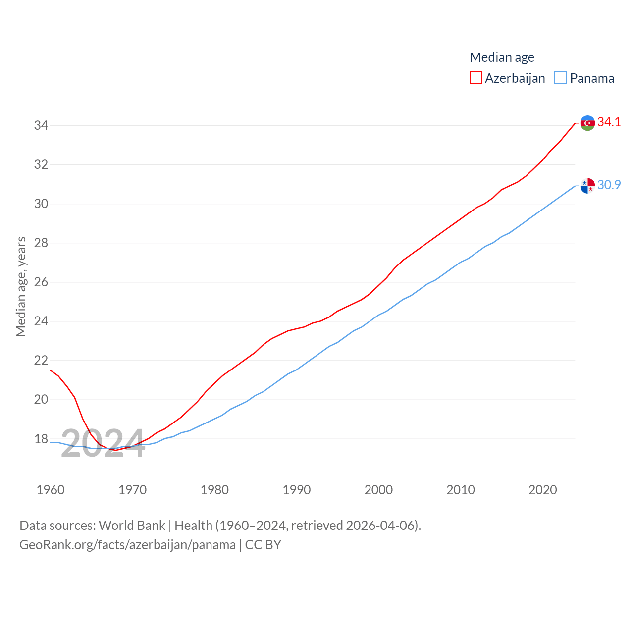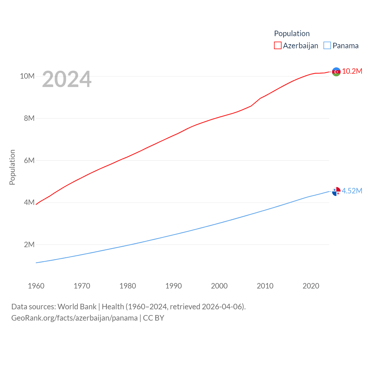 Azerbaijan has a population of 10.2M (ranked 95/197), compared with 4.52M in Panama (ranked 128/197). Azerbaijan's land area is 31,911 sq mi versus 28,641 sq mi for Panama (ranked 112th vs. 115th).
