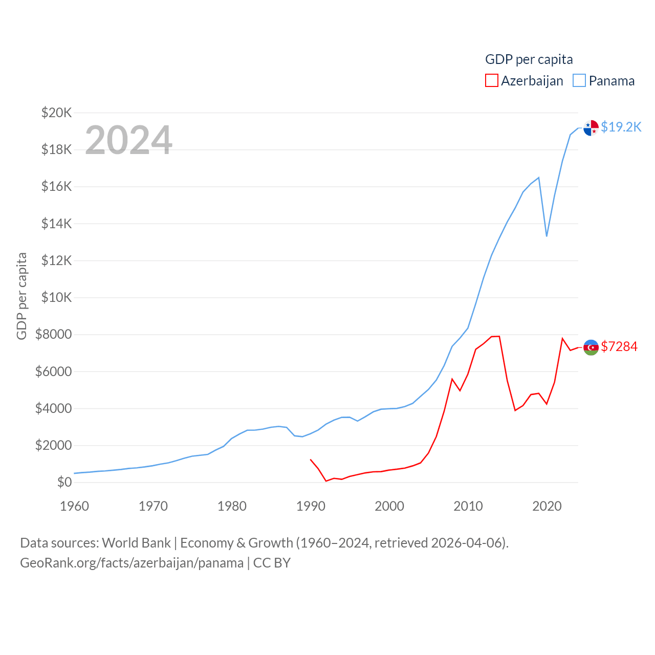 By GDP, Azerbaijan ranks 84/197 ($74.3B) and Panama ranks 78/197 ($86.5B). By GDP per capita, Azerbaijan ranks 101/197 ($7,284), while Panama ranks 60/197 ($19,161).