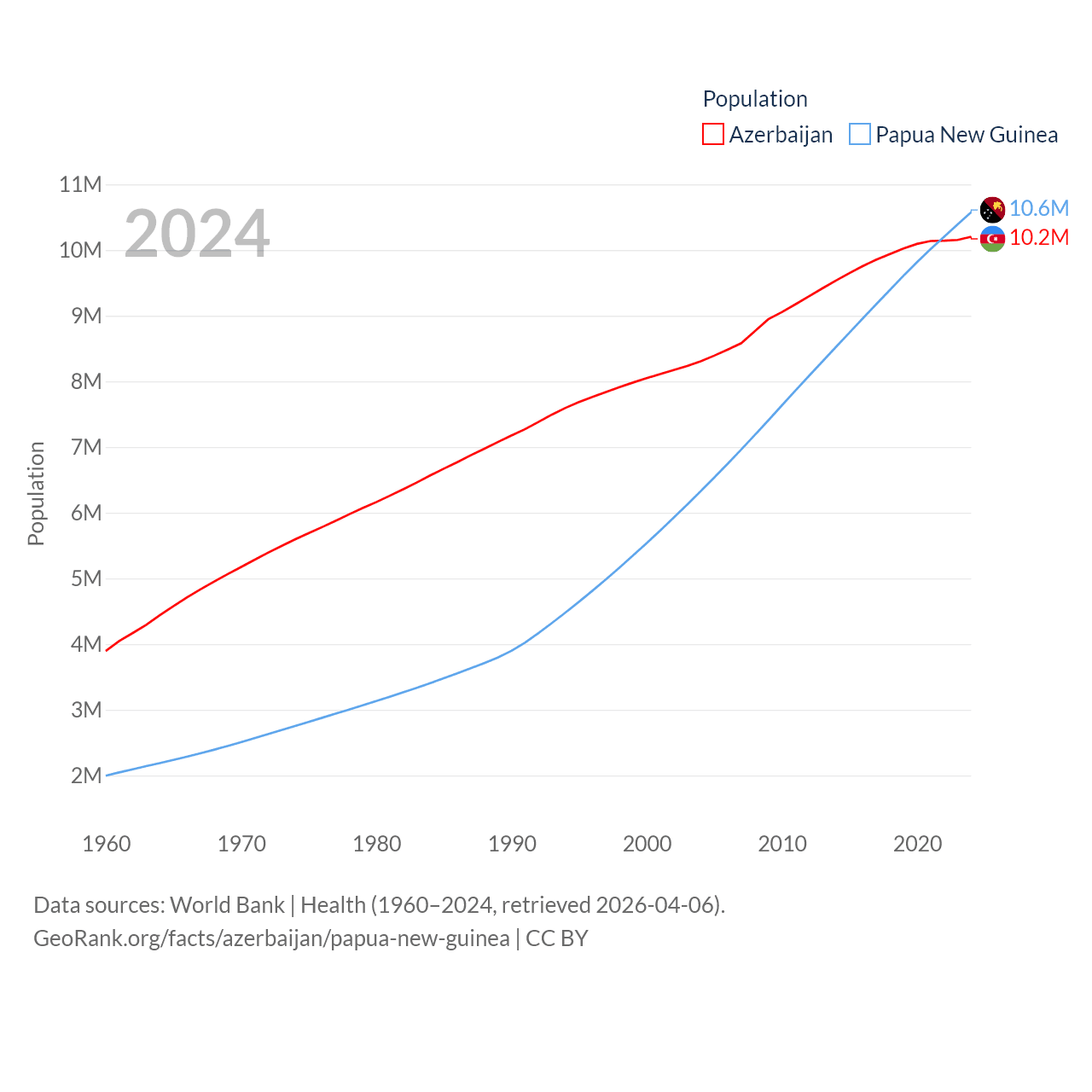 Azerbaijan has a population of 10.2M (ranked 95/197), compared with 10.6M in Papua New Guinea (ranked 92/197). Azerbaijan's land area is 31,911 sq mi versus 174,850 sq mi for Papua New Guinea (ranked 112th vs. 54th).
