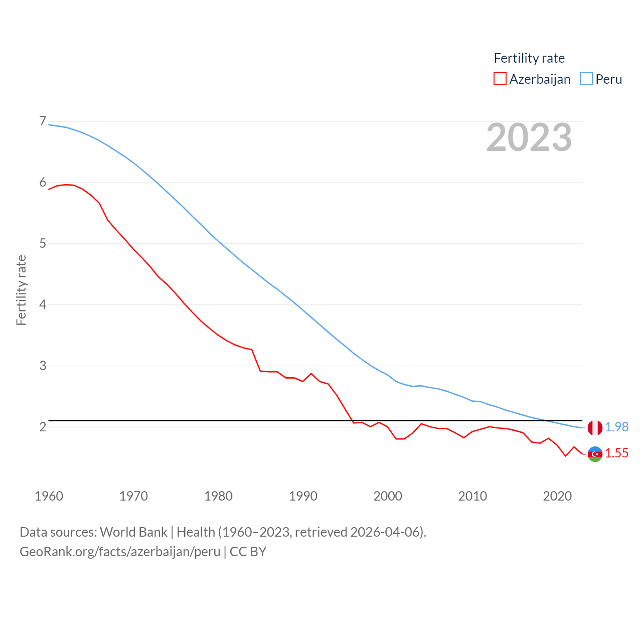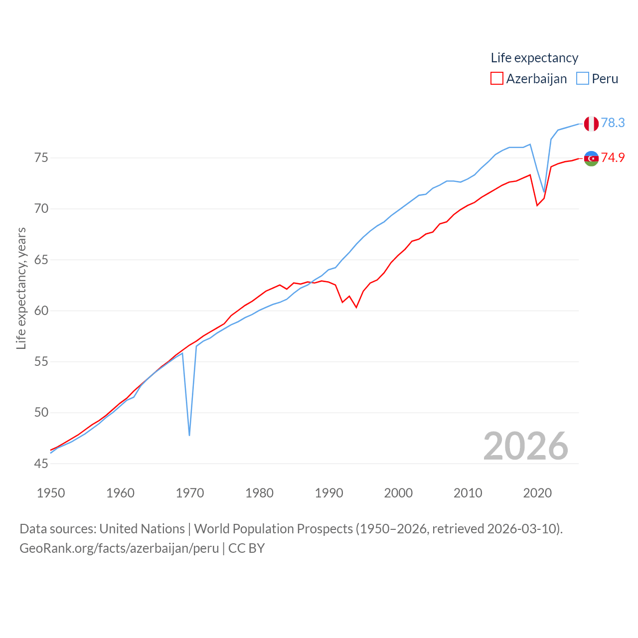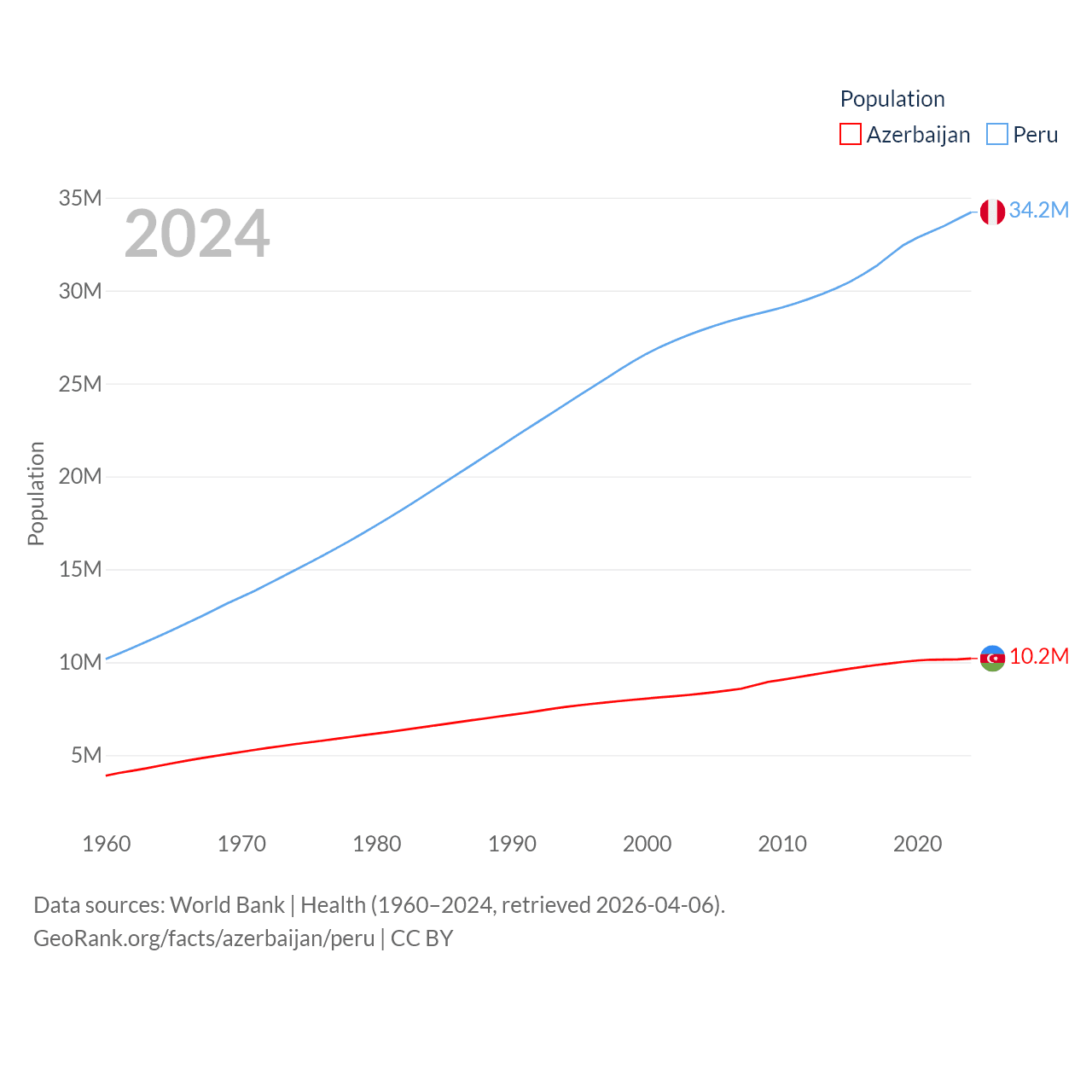 Azerbaijan has a population of 10.2M (ranked 95/197), compared with 34.2M in Peru (ranked 48/197). Azerbaijan's land area is 31,911 sq mi versus 494,211 sq mi for Peru (ranked 112th vs. 19th).