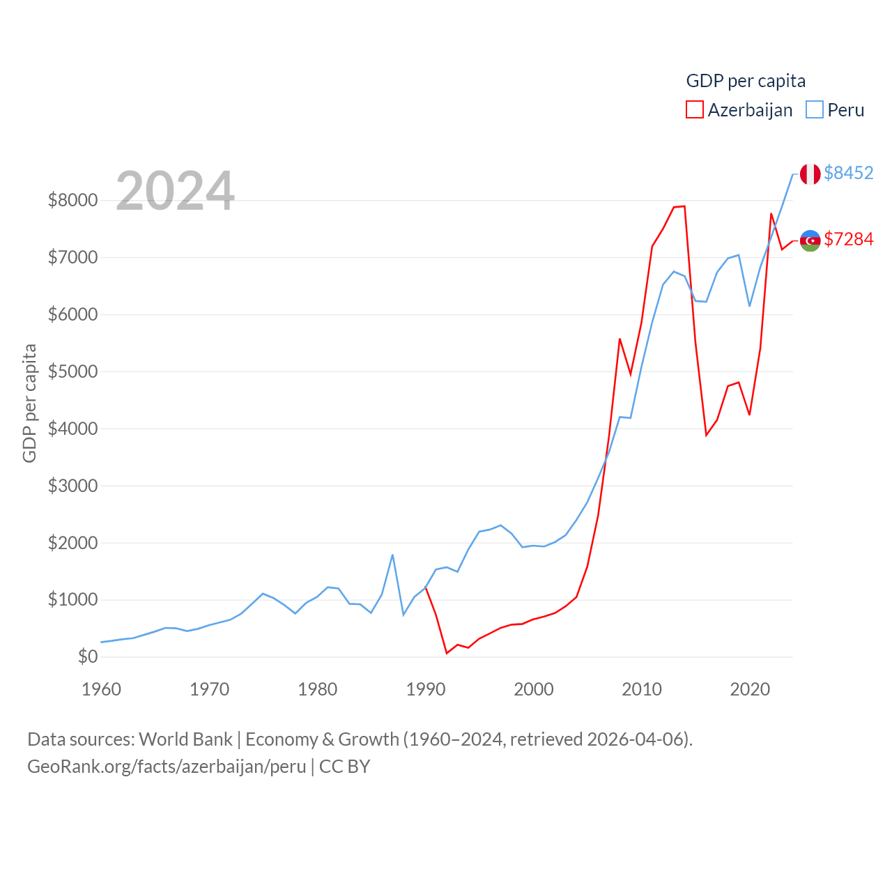 By GDP, Azerbaijan ranks 84/197 ($74.3B) and Peru ranks 49/197 ($289B). By GDP per capita, Azerbaijan ranks 101/197 ($7,284), while Peru ranks 91/197 ($8,452).