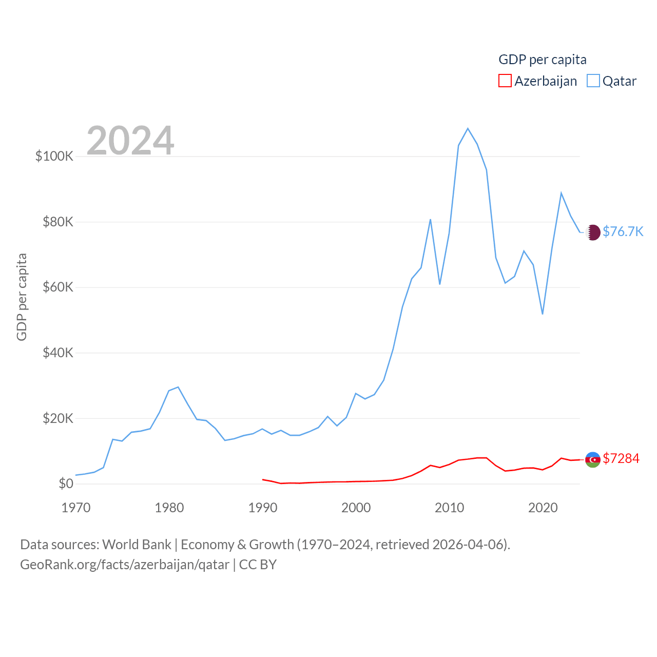 By GDP, Azerbaijan ranks 84/197 ($74.3B) and Qatar ranks 56/197 ($219B). By GDP per capita, Azerbaijan ranks 101/197 ($7,284), while Qatar ranks 11/197 ($76,689).