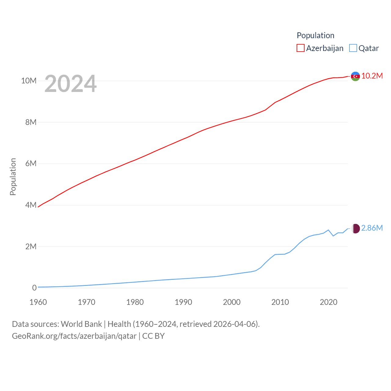 Azerbaijan has a population of 10.2M (ranked 95/197), compared with 2.86M in Qatar (ranked 138/197). Azerbaijan's land area is 31,911 sq mi versus 4,436 sq mi for Qatar (ranked 112th vs. 158th).