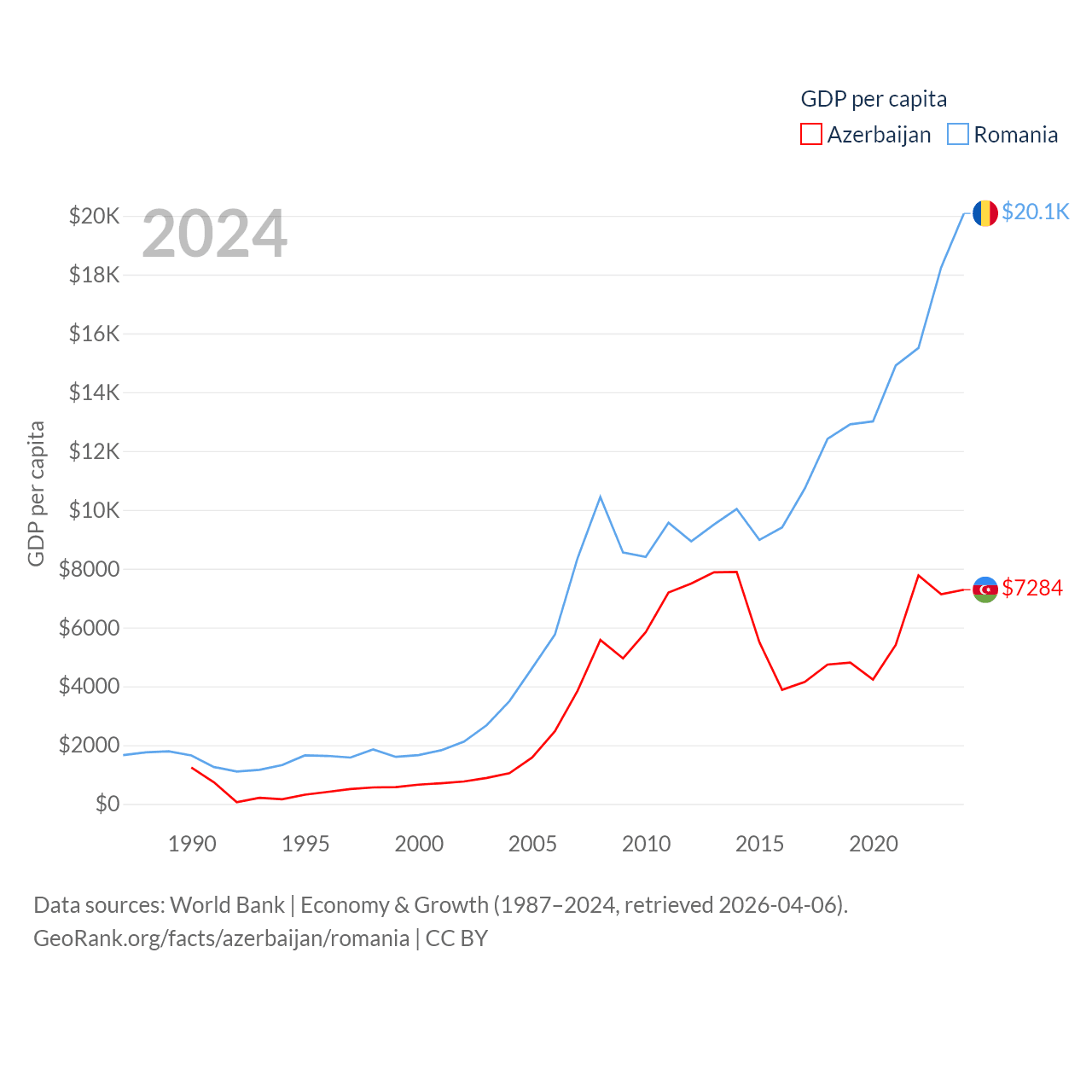 By GDP, Azerbaijan ranks 84/197 ($74.3B) and Romania ranks 42/197 ($383B). By GDP per capita, Azerbaijan ranks 101/197 ($7,284), while Romania ranks 58/197 ($20,080).
