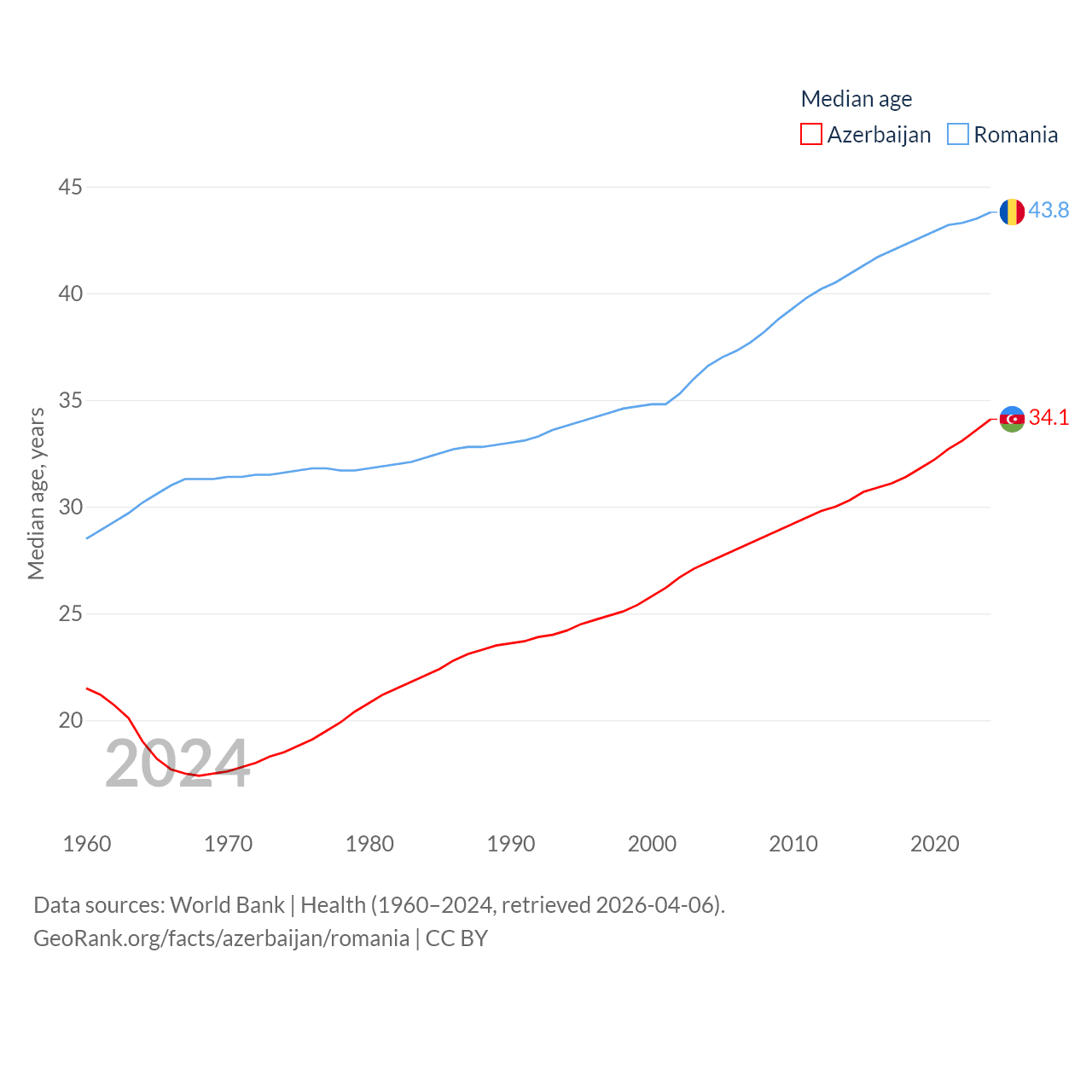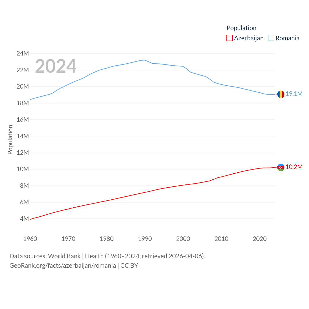 Azerbaijan has a population of 10.2M (ranked 95/197), compared with 19.1M in Romania (ranked 67/197). Azerbaijan's land area is 31,911 sq mi versus 88,834 sq mi for Romania (ranked 112th vs. 80th).